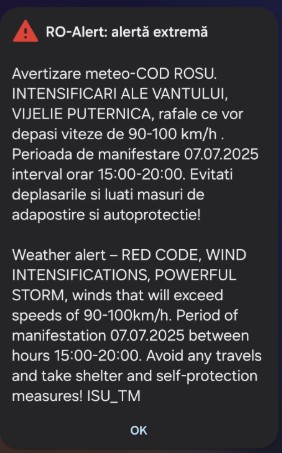 UPDATE. La ora 13, va fi trimisă o avertizare RO-Alert