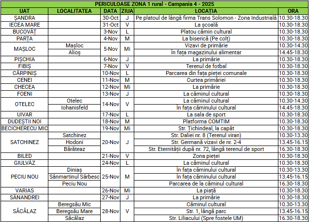 În perioada 30 octombrie – 28 noiembrie, în Zona 1 Rural, Timiș localitățile Șandra, Iecea Mare, Bucovăț, Parța, Mașloc (și în Alioș), Pișchia, Fibiș, Cărpiniș, Cenei, Checea, Foeni, Otelec (și în Iohanisfeld), Uivar, Dudeștii Noi, Becicherecu Mic, Satchinez (și în Hodoni și Bărăteaz), Biled, Giulvăz, Peciu Nou (și în Diniaș și Sânmartinul Sârbesc), Variaș, Sânandrei și Săcălaz (și în Beregsău Mic și Beregsău Mare), RETIM și ADID Timiș organizează a patra campanie de predare gratuită a deșeurilor periculoase din menajer din 2025.