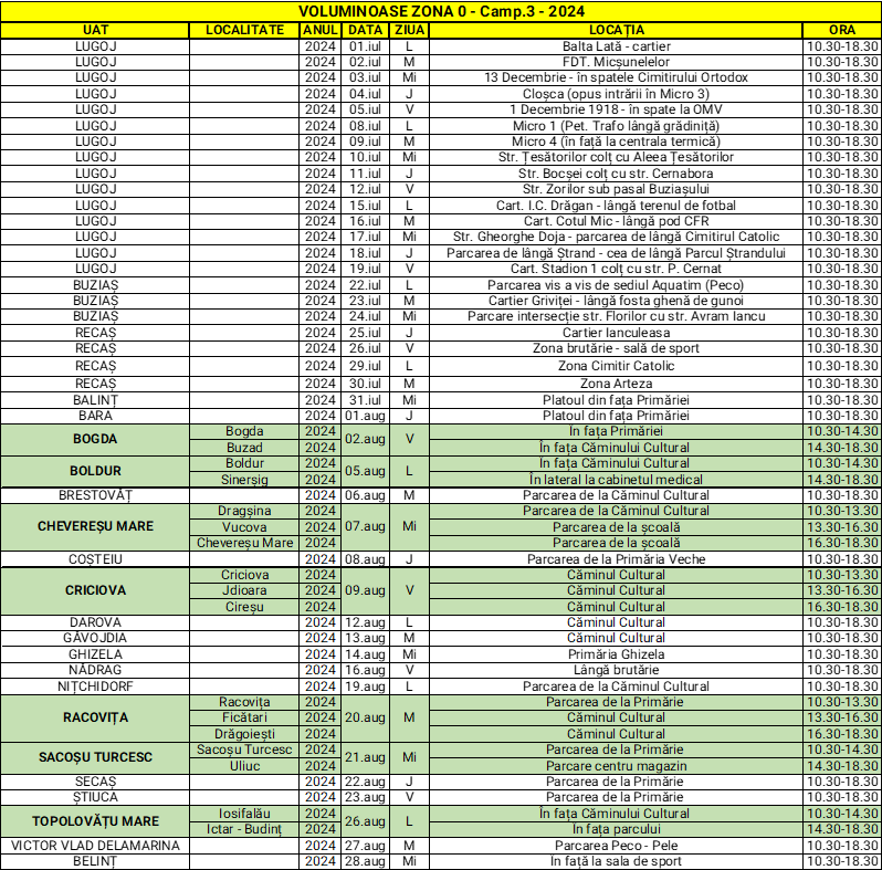 Cetățenii din localităţile menţionate mai sus pot depune prin aport voluntar și gratuit deșeurile voluminoase în containerele special puse la dispoziție în punctele de colectare și între orele menționate în tabelul de mai jos.