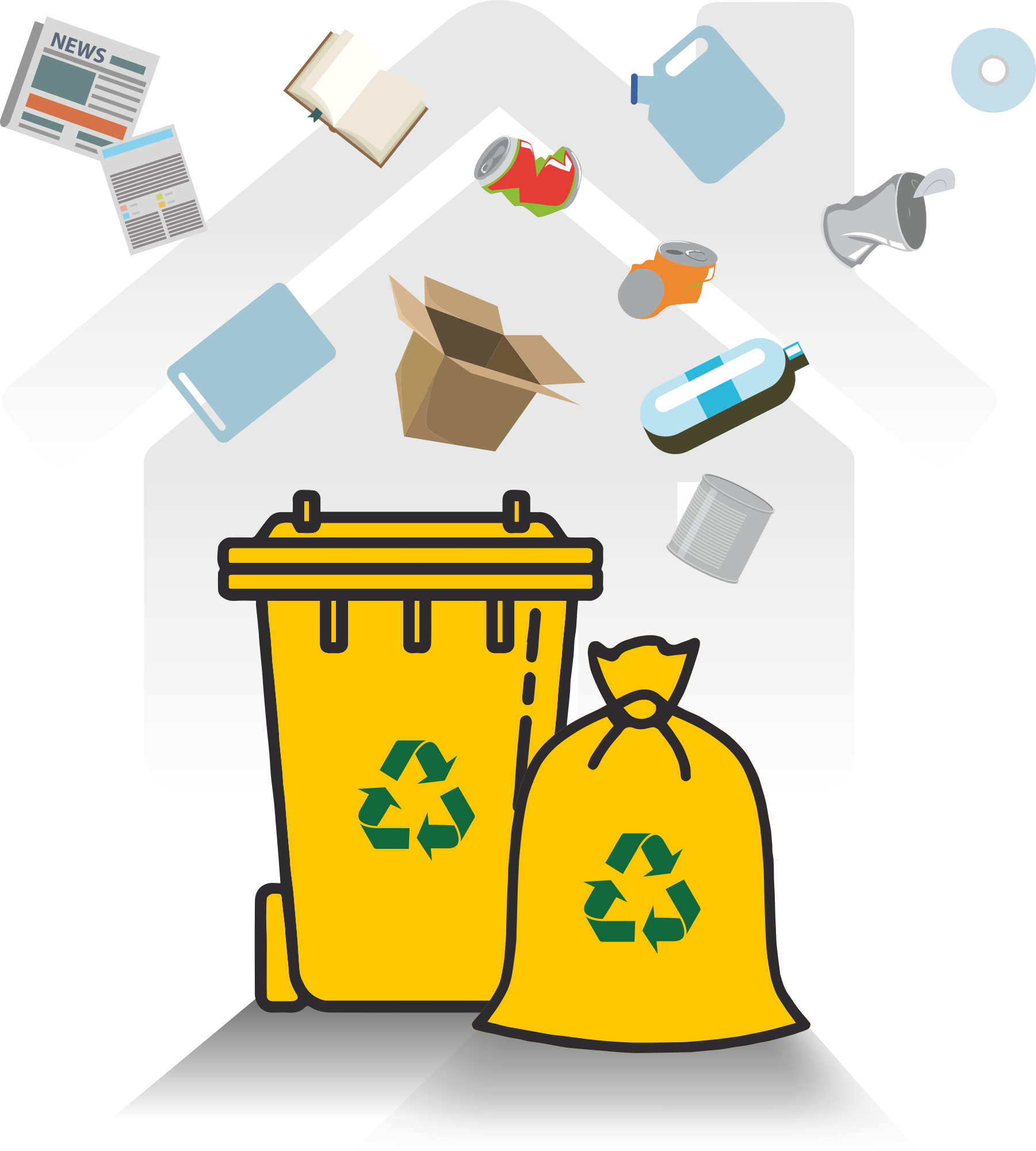 Pubela galbenă / sacul galben sunt folosite pentru orice tip de ambalaj din hârtie, carton, metal sau plastic care poate fi reciclat, după ce a fost golit complet de conținutul inițial: sticle de plastic de apă, suc, sau bere, caserole, pahare de iaurt, doze de aluminiu de la sucuri sau bere, cutii de pate, conserve de bulion sau legume, cutii de pantofi, ziare, reviste, cutii de lapte sau suc, folie de aluminiu, pungi și ambalaje de plastic, etc.