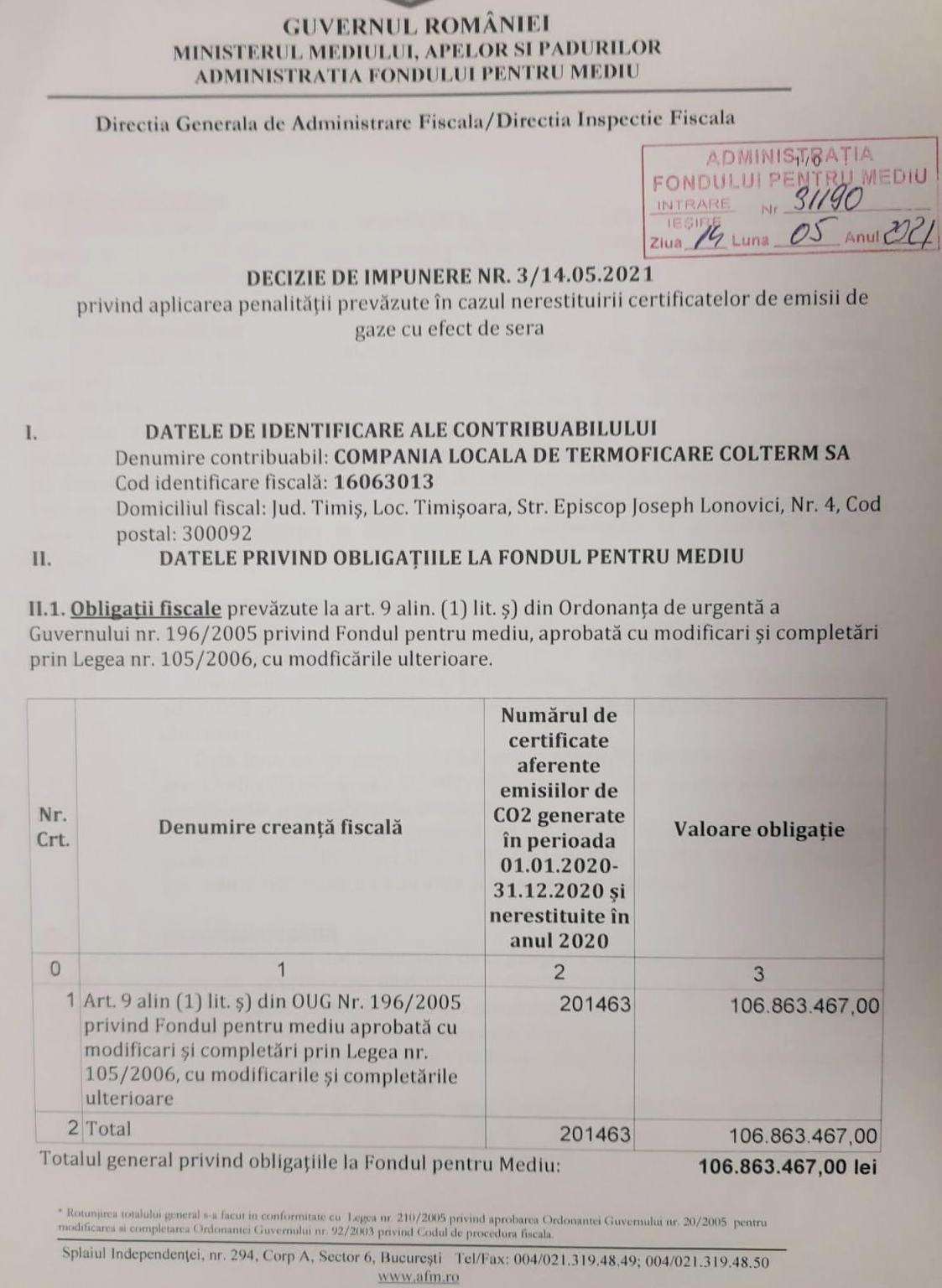 Administrația Fondului pentru Mediu a emis, în 14 mai, o decizie de impunere pentru suma de 106.863.467 lei, echivalentul a 21,6 milioane de euro, pentru Colterm, care nu a avut „numărul de certificate aferente emisiilor de CO2 generate în perioada 1 ianuarie – 31 decembrie 2020 și nerestituite în anul 2020”. Este vorba despre un total de 201.463 certificate de emisii de gaze cu efect de seră.