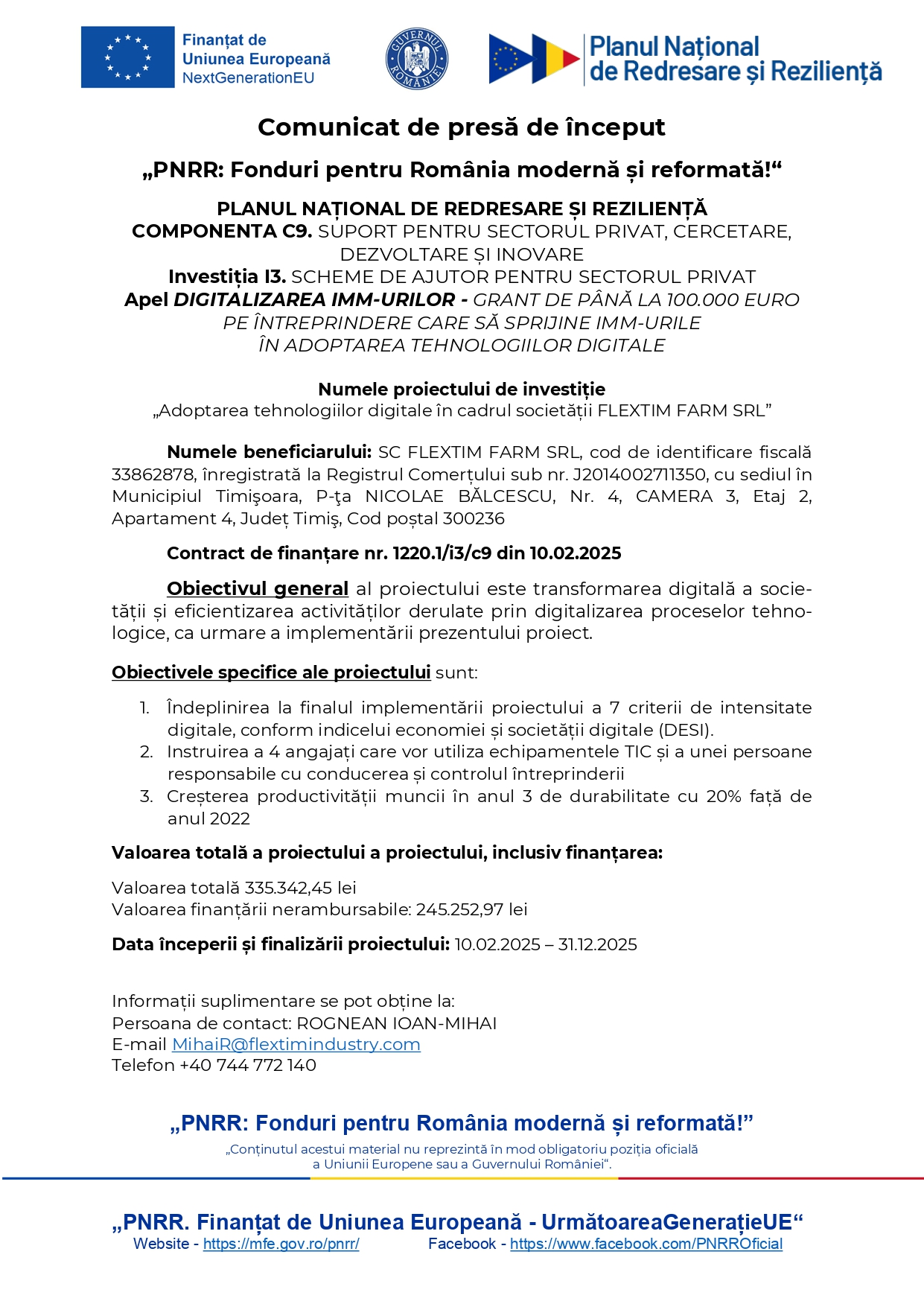 Numele proiectului de investiție „Adoptarea tehnologiilor digitale în cadrul societății FLEXTIM FARM SRL”