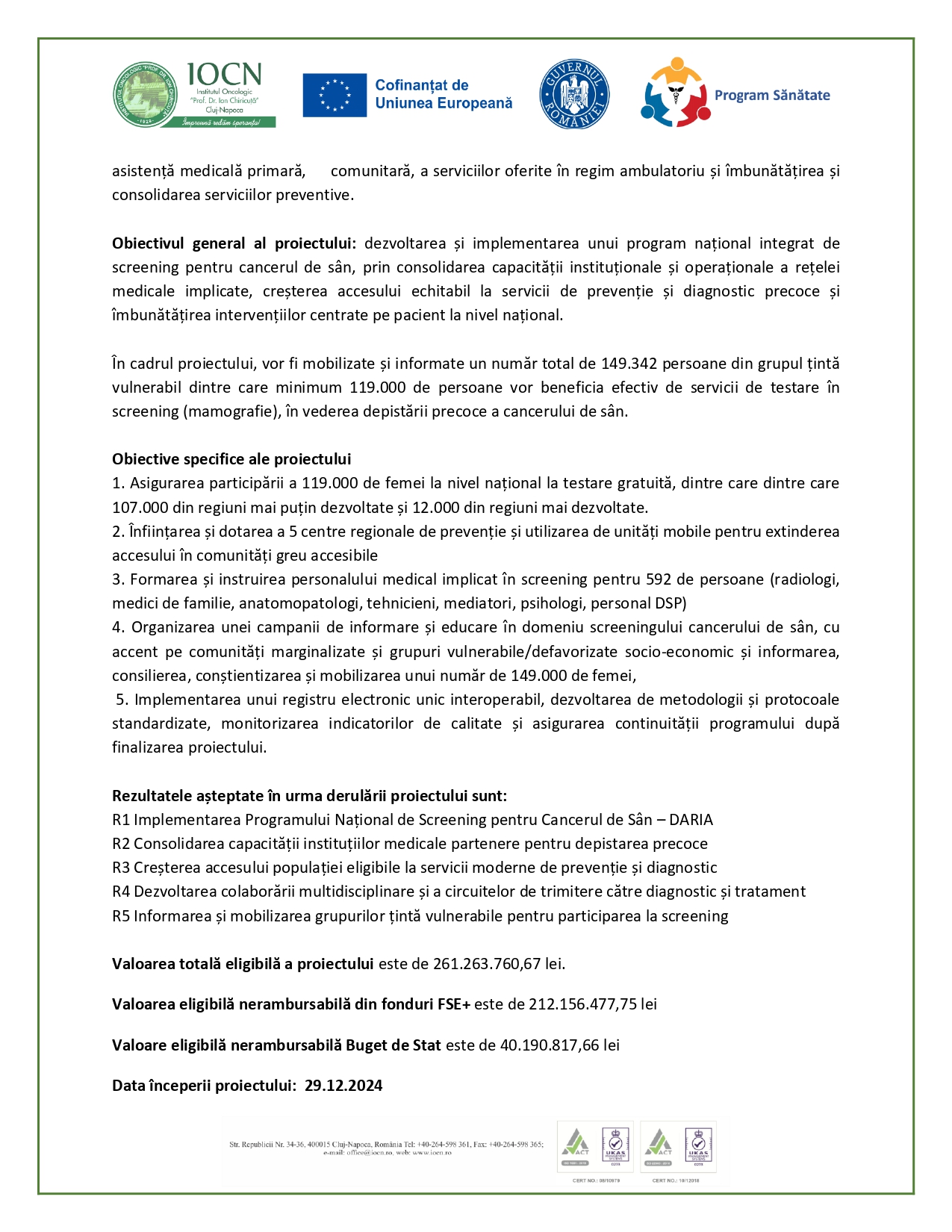 Obiectivul general al proiectului: dezvoltarea și implementarea unui program național integrat de screening pentru cancerul de sân, prin consolidarea capacității instituționale și operaționale a rețelei medicale implicate, creșterea accesului echitabil la servicii de prevenție și diagnostic precoce și îmbunătățirea intervențiilor centrate pe pacient la nivel național.