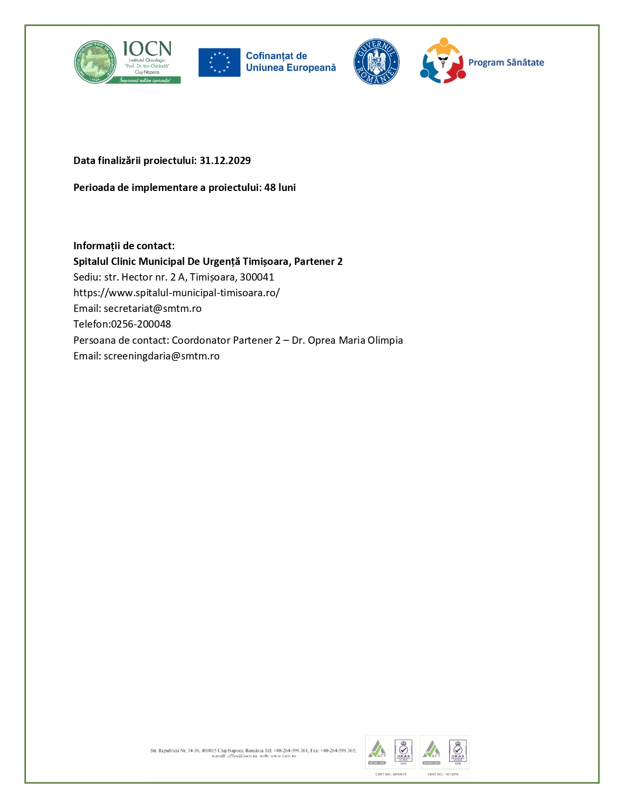 Persoana de contact: Coordonator Partener 2 – Dr. Oprea Maria Olimpia Email: screeningdaria@smtm.ro
