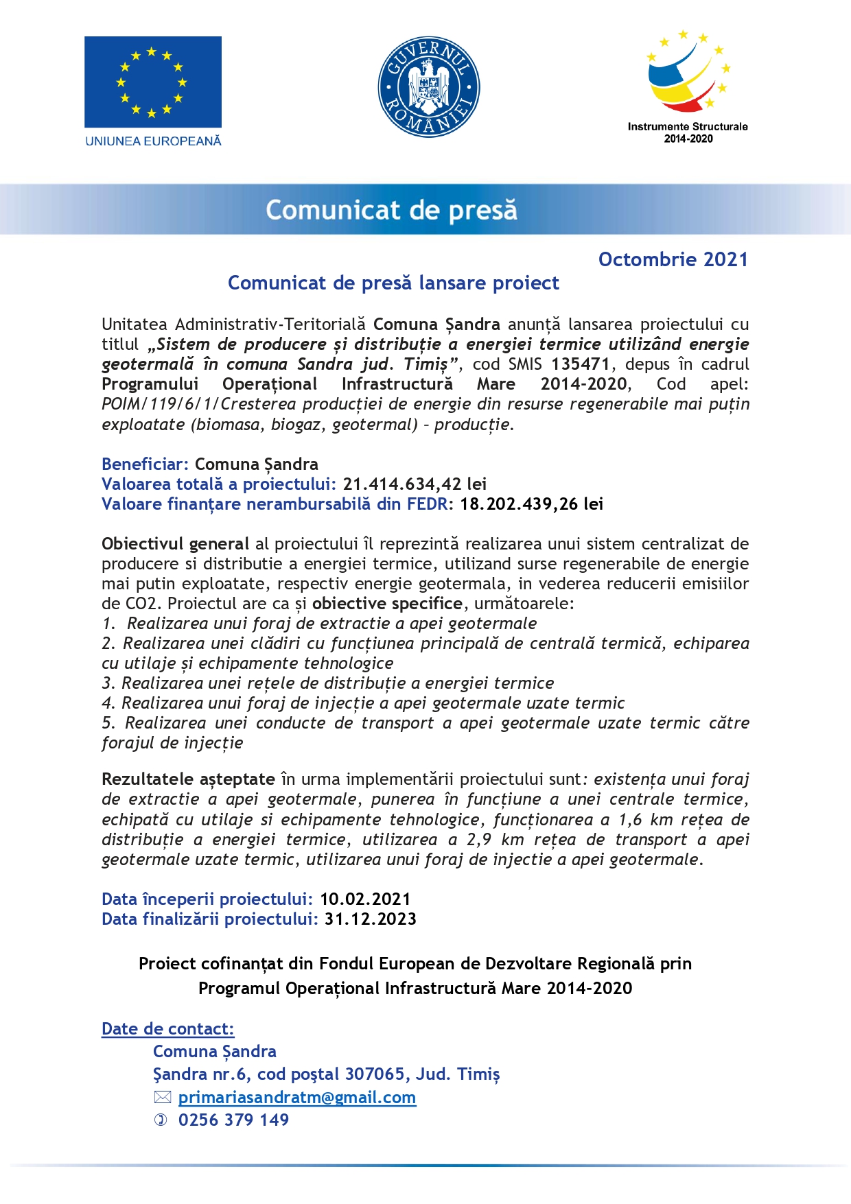 Unitatea Administrativ-Teritorială Comuna Șandra anunță lansarea proiectului cu titlul „Sistem de producere și distribuție a energiei termice utilizând energie geotermală în comuna Sandra jud. Timiș”, cod SMIS 135471, depus în cadrul Programului Operațional Infrastructură Mare 2014-2020, Cod apel: POIM/119/6/1/Cresterea producției de energie din resurse regenerabile mai puțin exploatate (biomasa, biogaz, geotermal) – producție.
