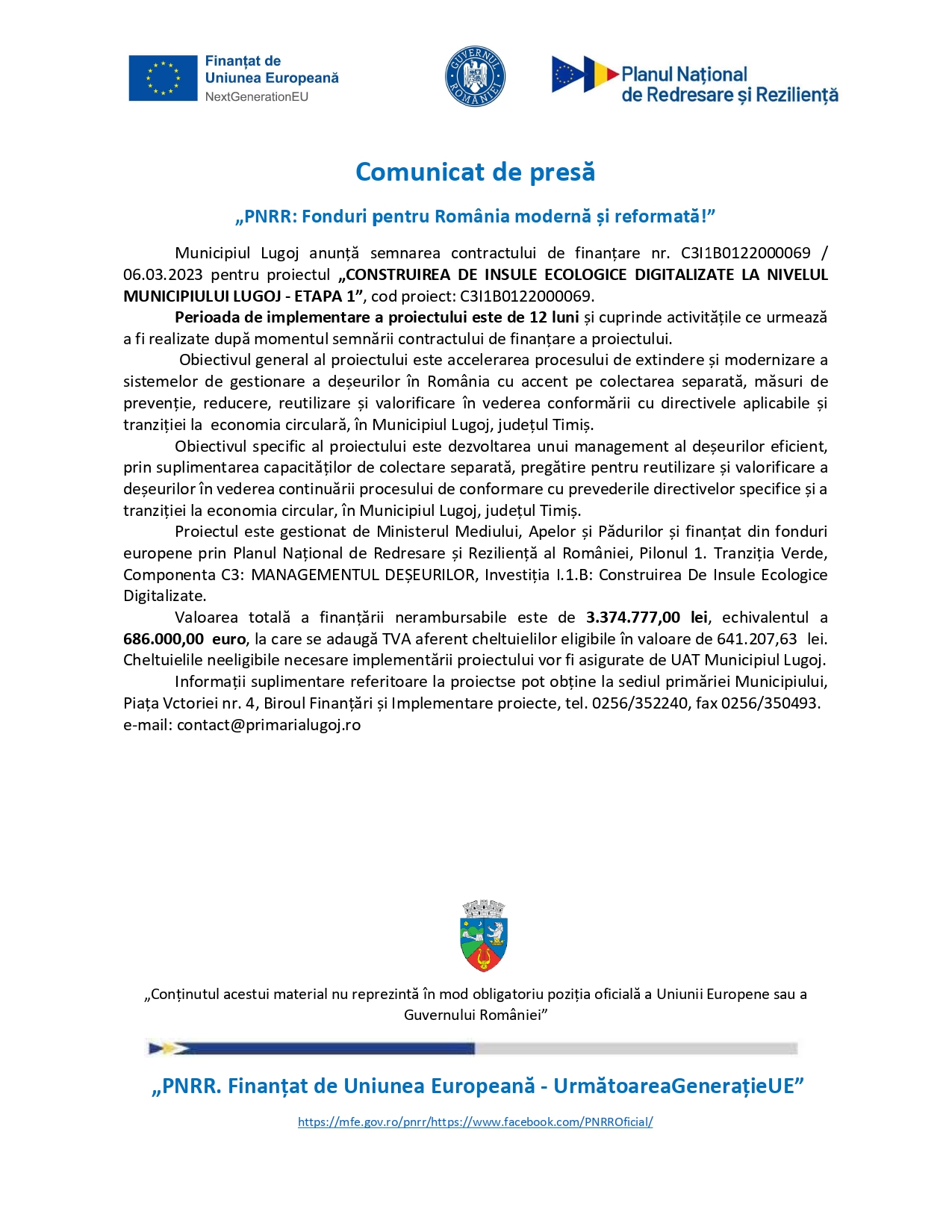 Proiectul este gestionat de Ministerul Mediului, Apelor și Pădurilor și finanțat din fonduri europene prin Planul Național de Redresare și Reziliență al României, Pilonul 1. Tranziția Verde, Componenta C3: MANAGEMENTUL DEȘEURILOR, Investiția I.1.B: Construirea De Insule Ecologice Digitalizate.