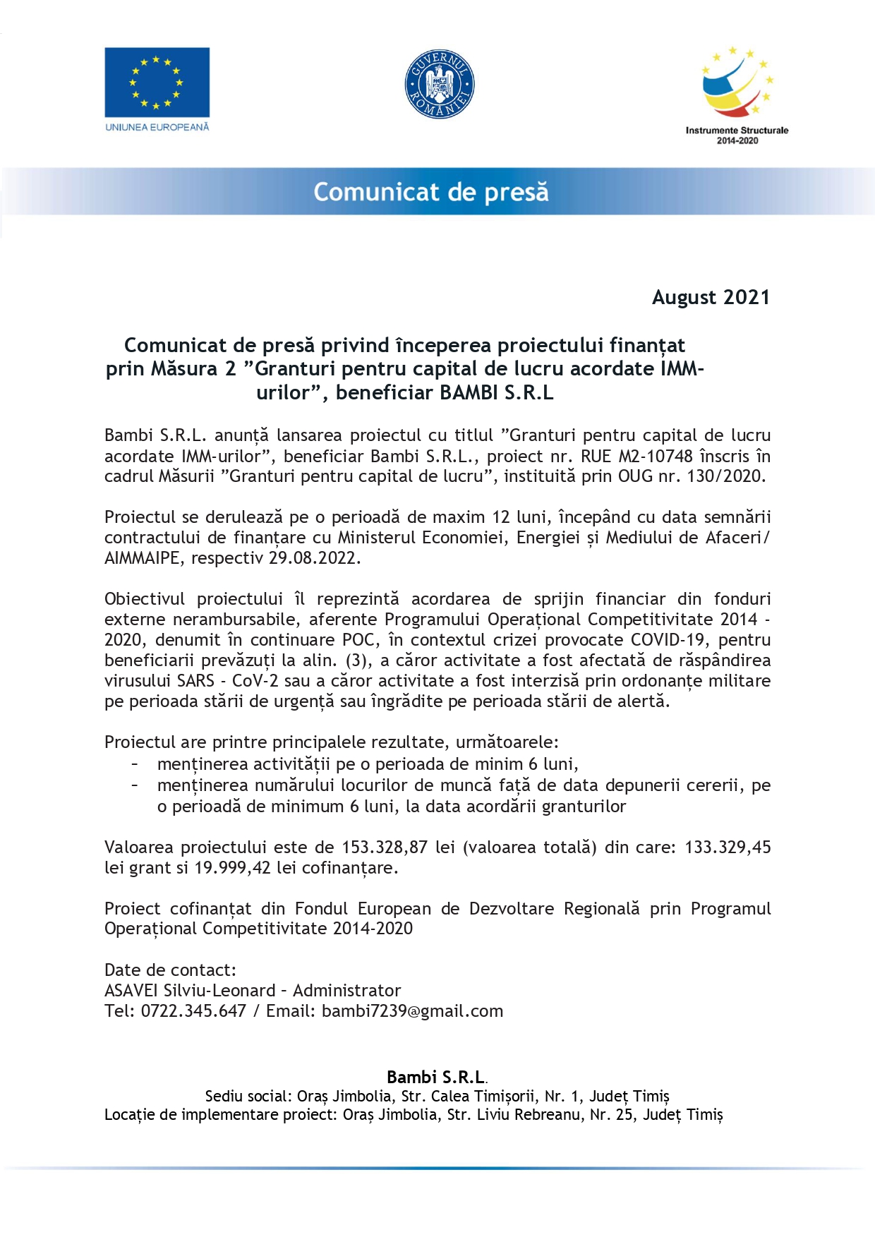 Obiectivul proiectului îl reprezintă acordarea de sprijin financiar din fonduri externe nerambursabile, aferente Programului Operațional Competitivitate 2014 – 2020, denumit în continuare POC, în contextul crizei provocate COVID-19, pentru beneficiarii prevăzuți la alin. (3), a căror activitate a fost afectată de răspândirea virusului SARS – CoV-2 sau a căror activitate a fost interzisă prin ordonanțe militare pe perioada stării de urgență sau îngrădite pe perioada stării de alertă.