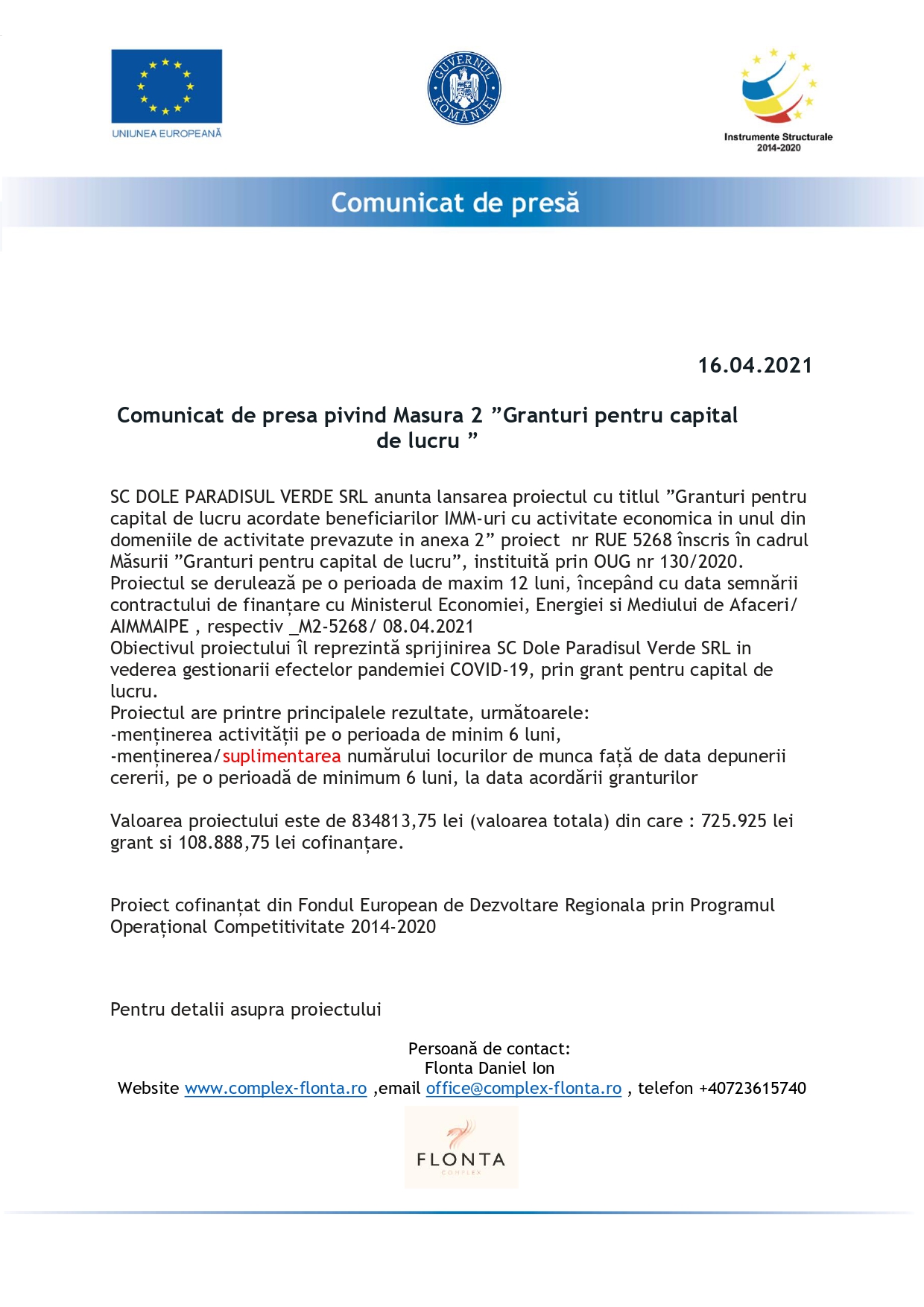 SC DOLE PARADISUL VERDE SRL anunta lansarea proiectul cu titlul ”Granturi pentru capital de lucru acordate beneficiarilor IMM-uri cu activitate economica in unul din domeniile de activitate prevazute in anexa 2” proiect nr RUE 5268 înscris în cadrul Măsurii ”Granturi pentru capital de lucru”, instituită prin OUG nr 130/2020.