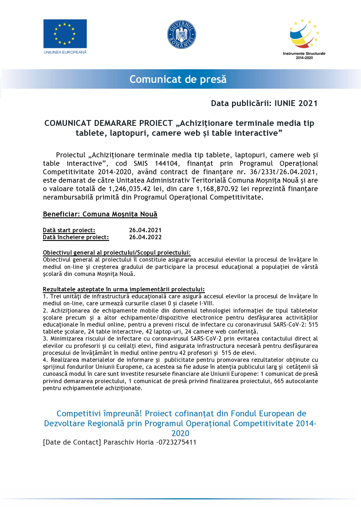 Proiectul „Achiziționare terminale media tip tablete, laptopuri, camere web și table interactive”, cod SMIS 144104, finanțat prin Programul Operațional Competitivitate 2014-2020, având contract de finanțare nr. 36/233t/26.04.2021, este demarat de către Unitatea Administrativ Teritorială Comuna Moșnița Nouă și are o valoare totală de 1,246,035.42 lei, din care 1,168,870.92 lei reprezintă finanțare nerambursabilă primită din Programul Operațional Competitivitate.