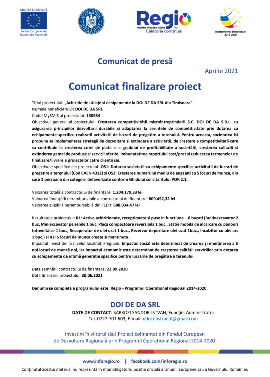 Rezultatele proiectului:R1: Active achizitionate, receptionate si puse in functiune –8 bucati (Buldoexcavator 2 buc, Miniexcavator pe senile 1 buc, Placa compactoare reversibila 1 buc., Statie mobila de incarcare cu panouri fotovoltaice 1 buc., Recuperator de ulei uzat 1 buc., Rezervor depozitare ulei uzat 1buc.,Incalzitor cu ulei ars 1 buc.) si R2: 5 locuri de munca create si mentinute.