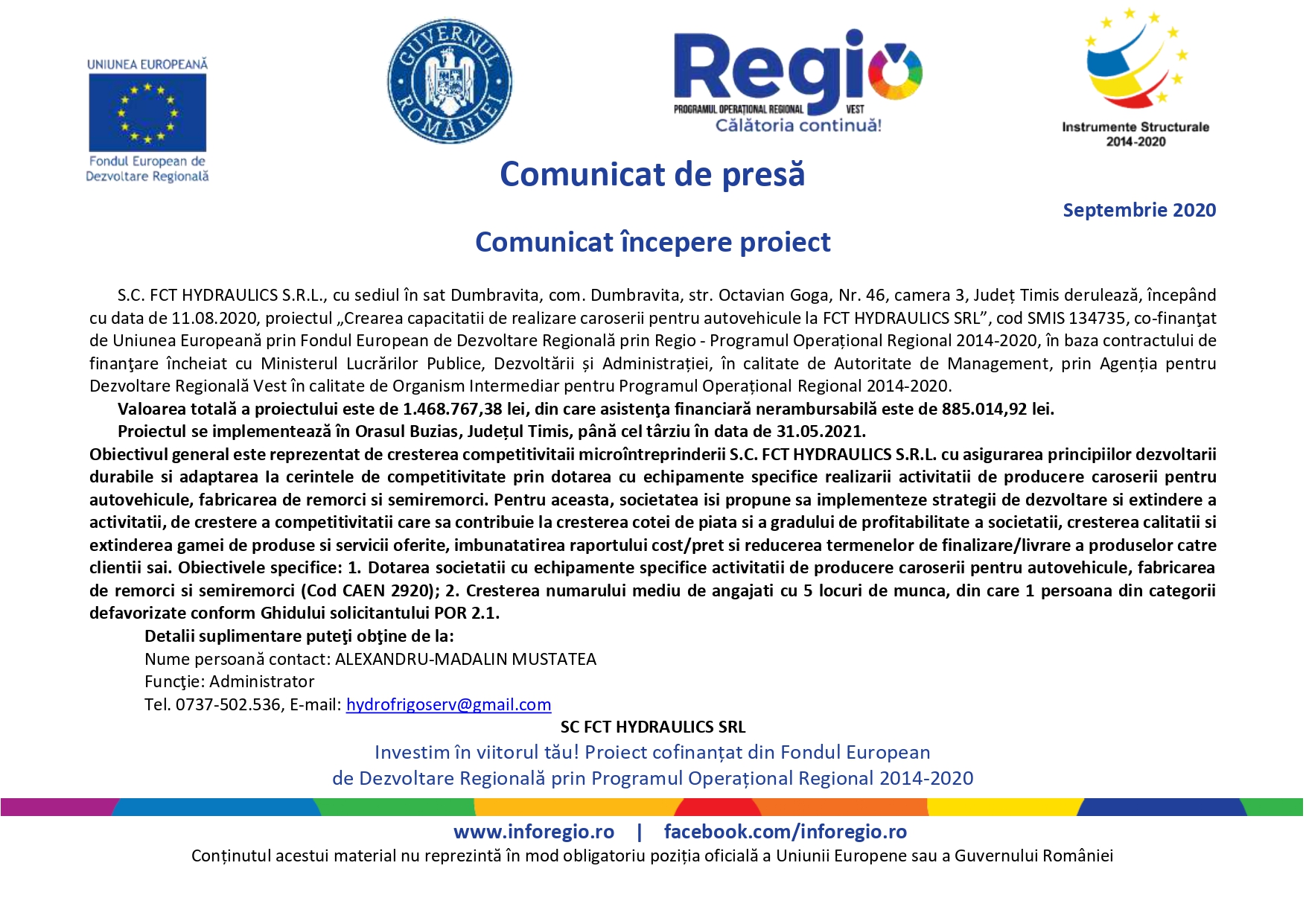 S.C. FCT HYDRAULICS S.R.L., cu sediul în sat Dumbravita, com. Dumbravita, str. Octavian Goga, Nr. 46, camera 3, Județ Timis derulează, începând cu data de 11.08.2020, proiectul „Crearea capacitatii de realizare caroserii pentru autovehicule la FCT HYDRAULICS SRL”, cod SMIS 134735, co-finanţat de Uniunea Europeană prin Fondul European de Dezvoltare Regională prin Regio – Programul Operațional Regional 2014-2020, în baza contractului de finanţare încheiat cu Ministerul Lucrărilor Publice, Dezvoltării și Administrației, în calitate de Autoritate de Management, prin Agenția pentru Dezvoltare Regională Vest în calitate de Organism Intermediar pentru Programul Operațional Regional 2014-2020.