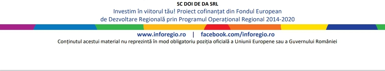Obiectivul general este reprezentat de creșterea competitivității microîntreprinderii S.C. DOI DE DA S.R.L. cu asigurarea principiilor dezvoltarii durabile si adaptarea Ia cerintele de competitivitate prin dotarea cu echipamente specifice realizarii activitatii de lucrari de pregatire a terenului. Pentru aceasta, societatea isi propune sa implementeze strategii de dezvoltare si extindere a activitatii, de crestere a competitivitatii care să contribuie la cresterea cotei de piata si a gradului de profitabilitate a societătii, cresterea calitatii si extinderea gamei de produse si servicii oferite, imbunatatirea raportului cost/pret si reducerea termenelor de finalizare/livrare a proiectelor catre clientii sai. Obiectivele specifice: 1. Dotarea societatii cu echipamente specifice activitatii de lucrari de pregatire a terenului (Cod CAEN 4312); 2. Cresterea numarului mediu de angajati cu 5 locuri de munca, din care 1 persoana din categorii defavorizate conform Ghidului solicitantului POR 2.1