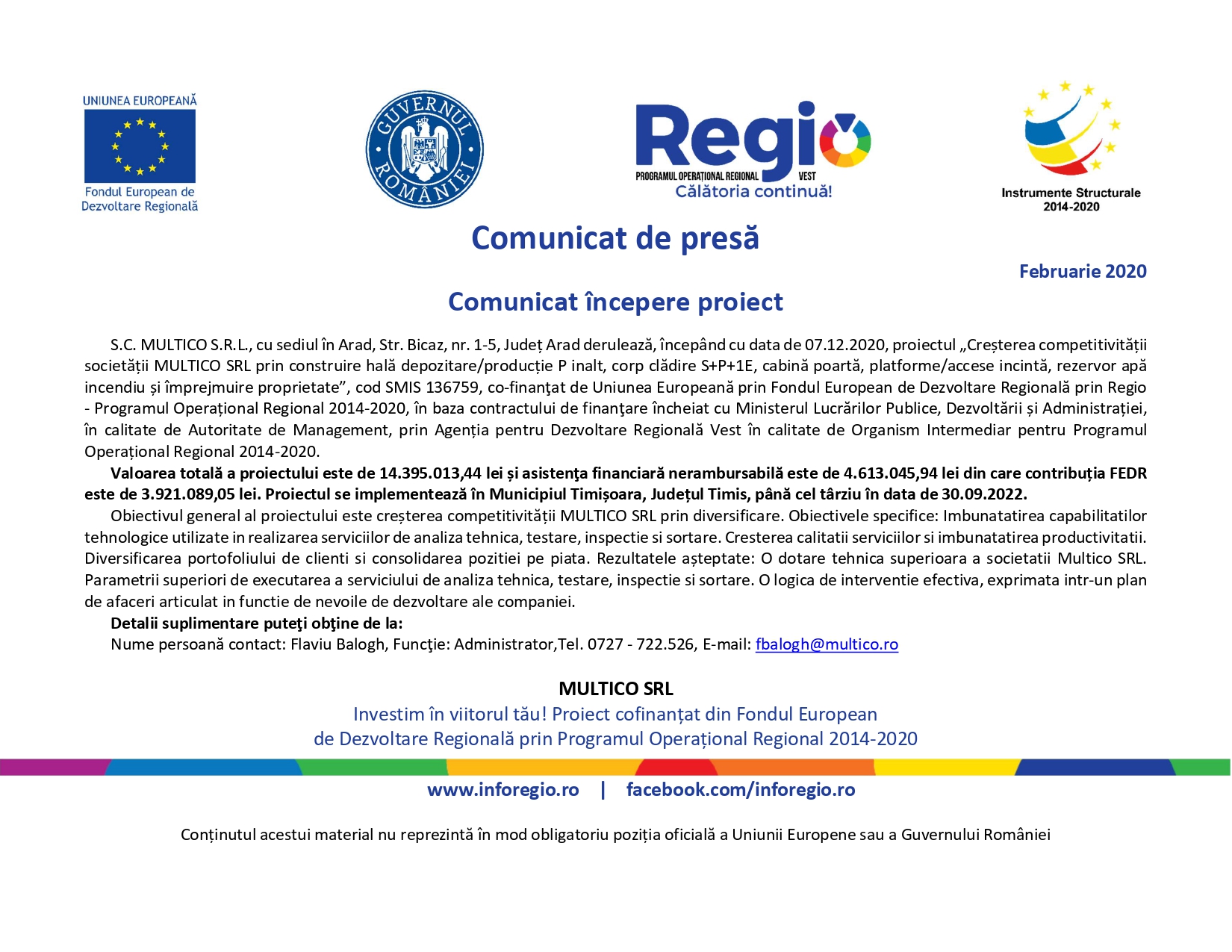 S.C. MULTICO S.R.L., cu sediul în Arad, Str. Bicaz, nr. 1-5, Județ Arad derulează, începând cu data de 07.12.2020, proiectul „Creșterea competitivității societății MULTICO SRL prin construire hală depozitare/producție P inalt, corp clădire S+P+1E, cabină poartă, platforme/accese incintă, rezervor apă incendiu și împrejmuire proprietate”, cod SMIS 136759, co-finanţat de Uniunea Europeană prin Fondul European de Dezvoltare Regională prin Regio – Programul Operațional Regional 2014-2020, în baza contractului de finanţare încheiat cu Ministerul Lucrărilor Publice, Dezvoltării și Administrației, în calitate de Autoritate de Management, prin Agenția pentru Dezvoltare Regională Vest în calitate de Organism Intermediar pentru Programul Operațional Regional 2014-2020.