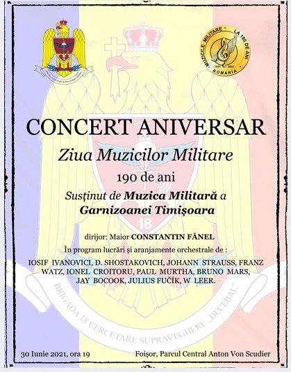 Brigada 18 Cercetare Supraveghere „Decebal” organizează miercuri, 30 iunie, un concert aniversar cu prilejul sărbătoririi Zilei Muzicilor Militare. Evenimentul va începe de la ora 19, în foișorul situat în Parcul Central „Anton Von Scudier” din Timișoara.