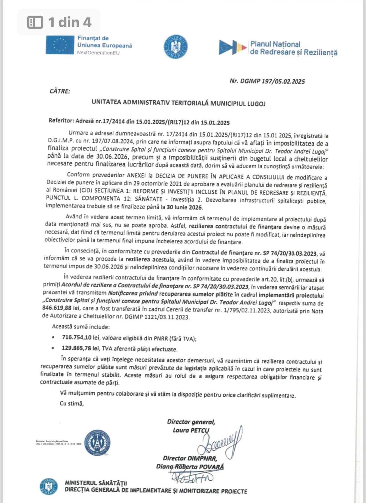 Primarul municipiului Lugoj, Călin Dobra, a declarat că nu a cerut niciodată rezilierea contractului pentru noul spital. Edilul a transmis că demersurile făcute de Primăria Lugoj au vizat găsirea de soluții pentru continuarea proiectului, nu oprirea lui.