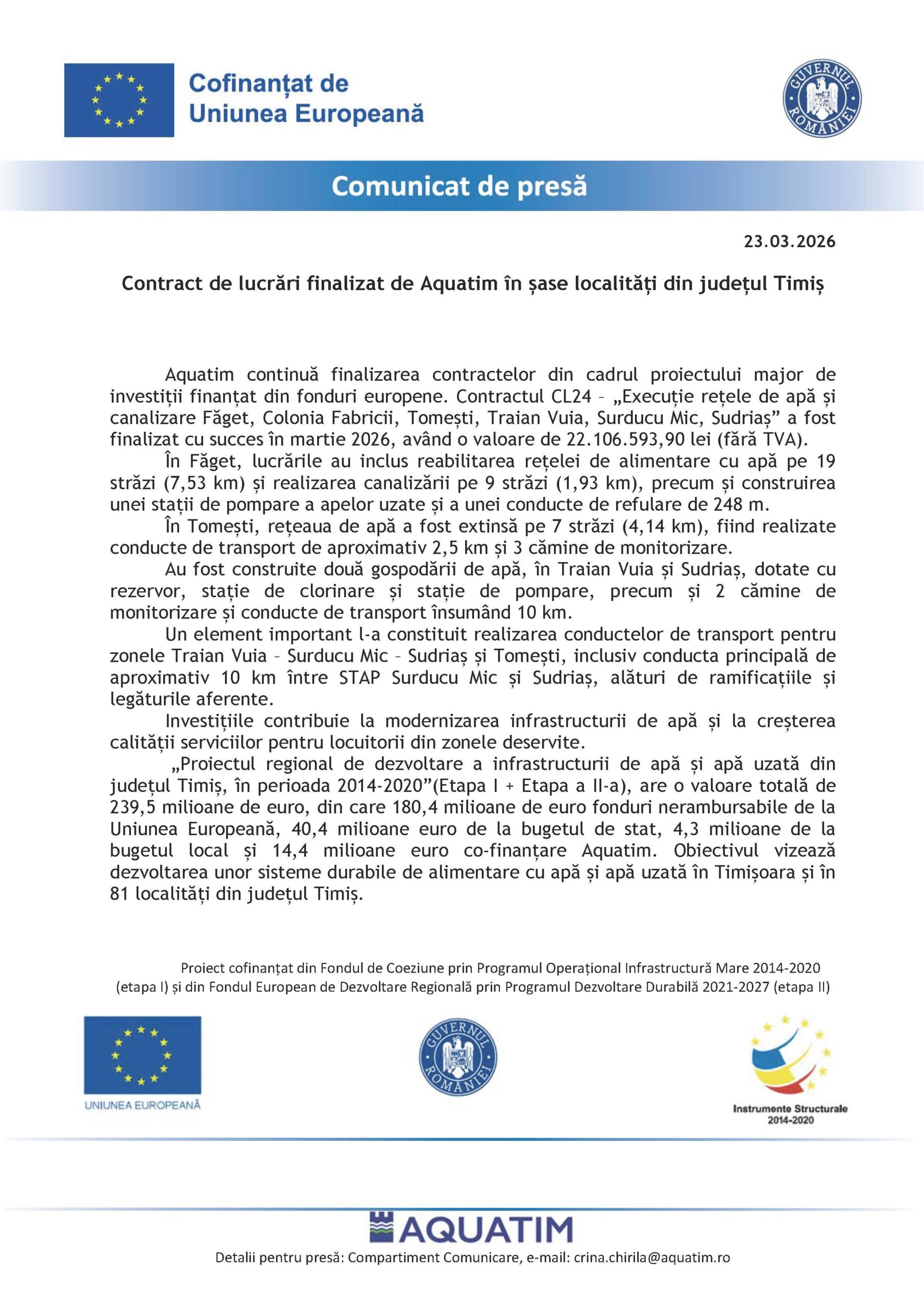 „Proiectul regional de dezvoltare a infrastructurii de apă și apă uzată din județul Timiș, în perioada 2014-2020”(Etapa I + Etapa a II-a), are o valoare totală de 239,5 milioane de euro, din care 180,4 milioane de euro fonduri nerambursabile de la Uniunea Europeană, 40,4 milioane euro de la bugetul de stat, 4,3 milioane de la bugetul local și 14,4 milioane euro co-finanțare Aquatim. Obiectivul vizează dezvoltarea unor sisteme durabile de alimentare cu apă și apă uzată în Timișoara și în 81 localități din județul Timiș.