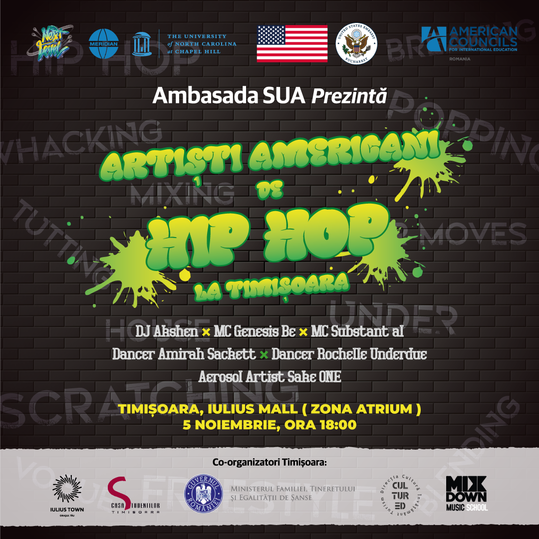 The Two-Step, The Monestary, The Billy Bounce, The Woah sunt câteva dintre mișcările pe care le veți putea vedea și chiar învăța sâmbătă, 5 noiembrie 2022, la evenimentul Artiști americani de Hip Hop la Timișoara. DJ Aksen, MC Substantial, MC Genesis Be, Dancer Amirah Sackett, Dancer Rochelle Underdue și Aerosol/Graffiti/Tatoo artist Sake ONE sunt invitații speciali, care au susținut mai multe workshop-uri pentru tinerii talentați din Timișoara. Aceștia vor cuceri prin dans Atriumul Iulius Town, începând cu ora 18:00.