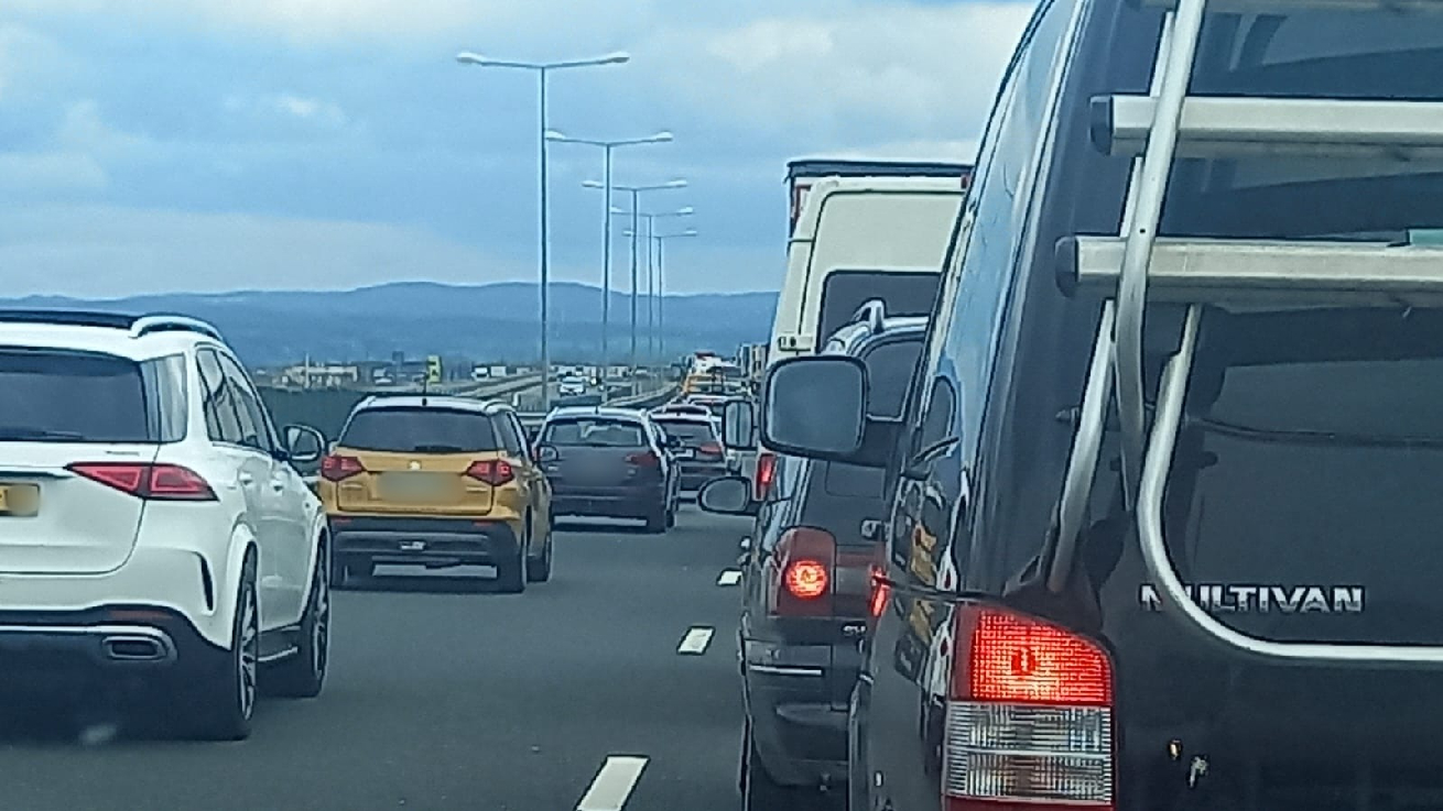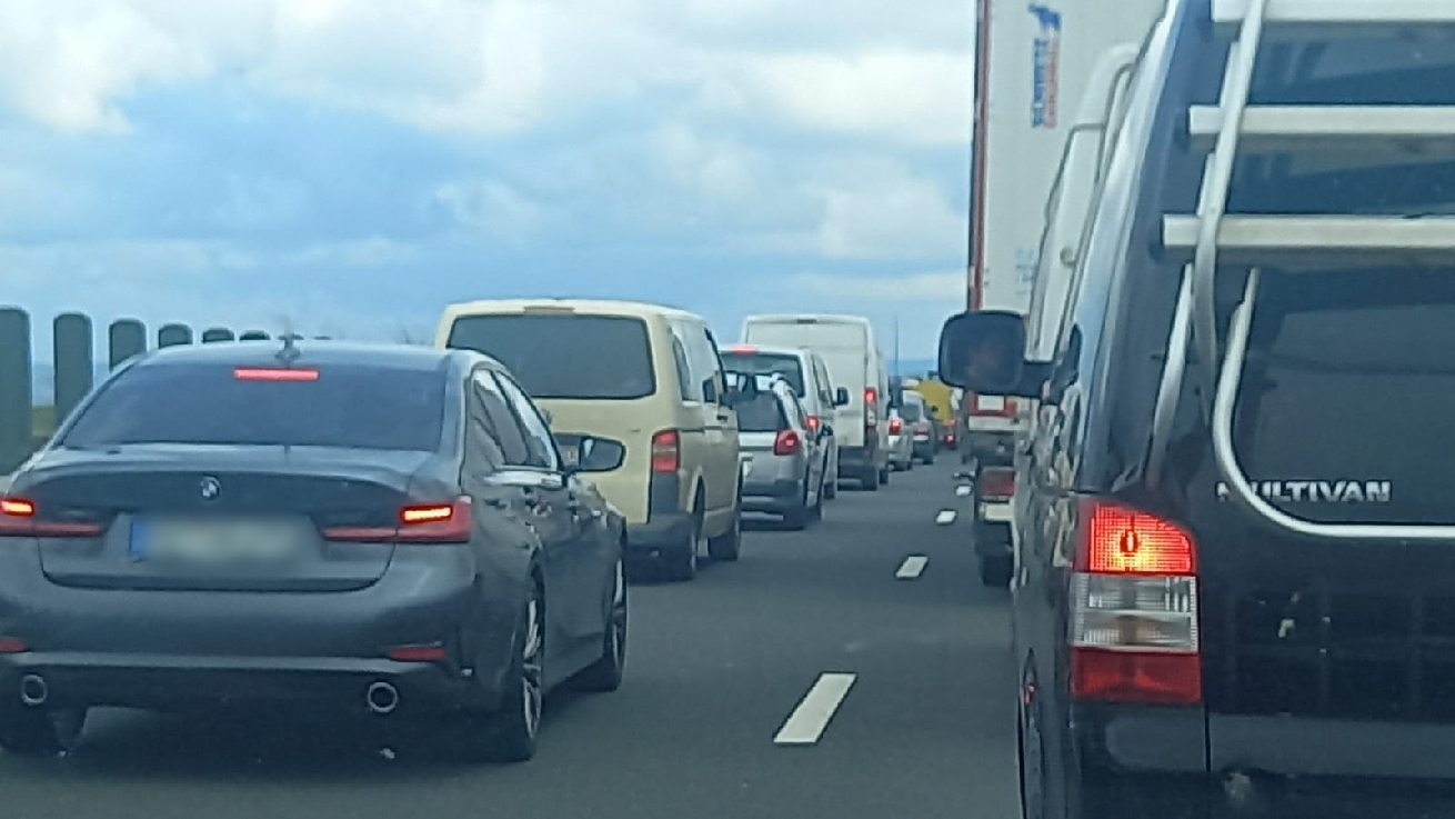 După cum se poate observa din fotografiile trimise de un cititor Tion pe adresa redacției, vineri după-amiază se înregistrează cozi kilometrice, iar șoferii pierd timp prețios stând în coloană înainte de Margina, la ieșirea de pe A1. Este exact tronsonul unde autostrada A1 lipsește, celebra bucată cu tunelurile pentru urși de la câmpie.