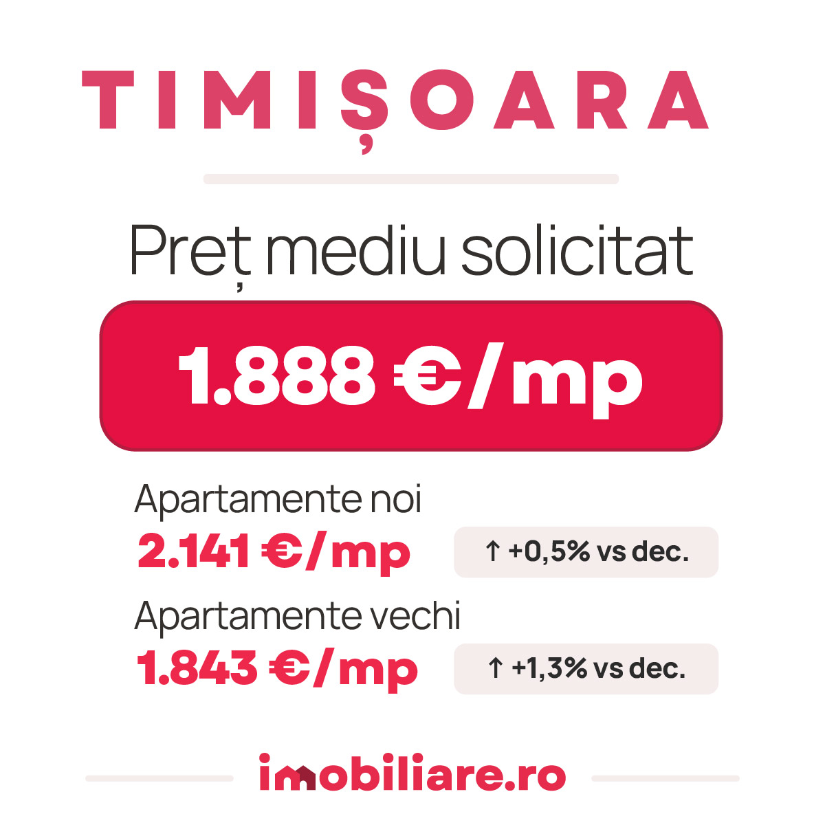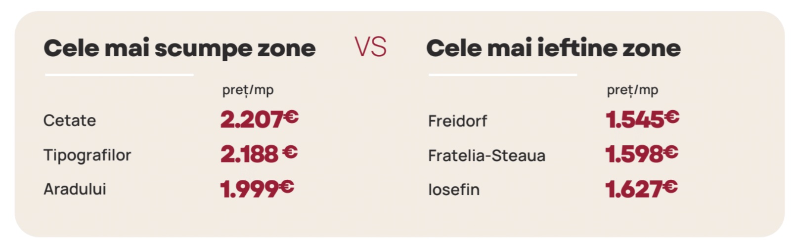Cea mai accesibilă zonă este Freidorf, unde pentru un metru pătrat, s-a cerut, în medie, 1.545 de euro. Prețuri mai mari plătesc cei care își doresc să se mute în zona Iosefin. În acest caz, prețul mediu este 1.627 euro/mp util.