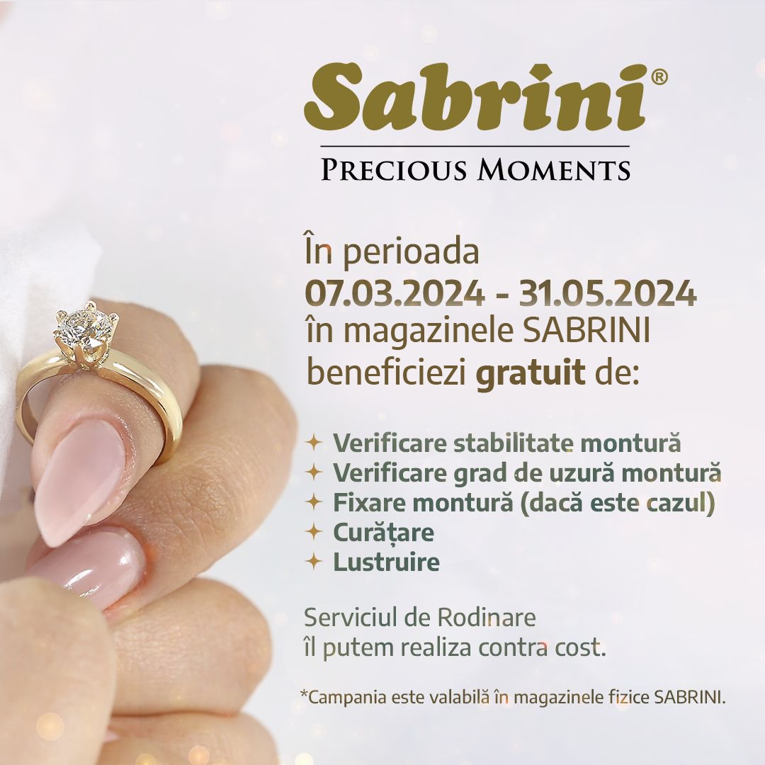 Fie că este vorba de un inel din aur cu Diamant natural, de o pereche de cercei cu Safire sau de o brățară tennis cu pietre prețioase, orice femeie are o relaţie specială cu bijuteriile sale, pentru că acestea sunt parte din „bagajul” prin care îşi exprimă stilul, personalitatea, preferinţele. De multe ori, purtăm cu mare grijă bijuteriile şi ştim că, pentru a-şi păstra frumuseţea şi strălucirea, este nevoie ca, periodic, acestea să beneficieze de întreţinere şi cosmetizare profesională. Până în 31 mai 2024, SABRINI oferă servicii profesionale gratuite de verificare stabilitate montură, verificare grad de uzură montură, fixare montură, curățare și lustruire a bijuteriilor cu diamante si pietre prețioase.