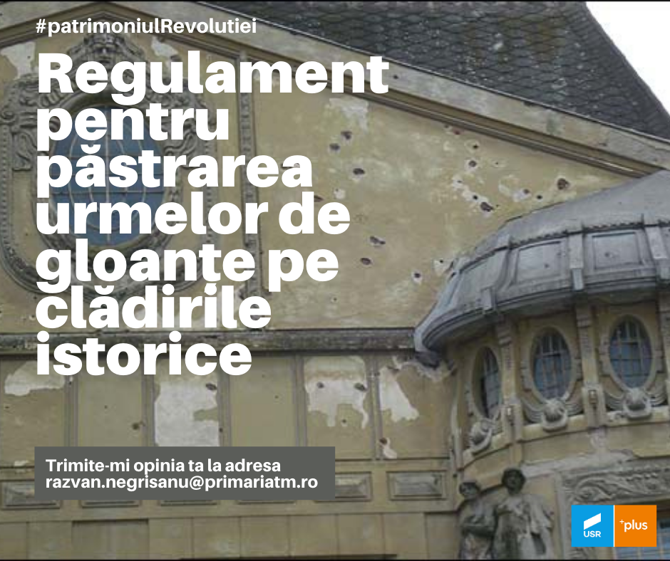 „Spuneți-mi părerea voastră în comentarii sau trimiteți un mail cu sugestii la următoarea adresă razvan.negrisanu@primariatm.ro. Lansez aici proiectul de regulament cu privire la reabilitarea clădirilor care prezintă urme de gloanțe sau alte proiectile din Revoluția din Decembrie 1989. I-am promis dlui Corneliu N. Vaida că-l fac și după consultarea cu voi îl voi depune spre aprobare în consiliul local. Regulamentul urmărește să prevină ștergea urmelor istorice ale revoluției în cadrul lucrărilor de conservare, consolidare, restaurare și reabilitare a clădirilor monument istoric sau din zone protejate”, transmite arhitectul.