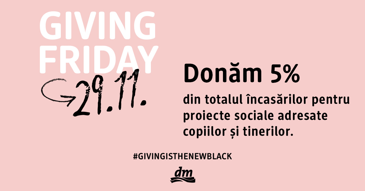 Din 2019, cu ajutorul campaniei Giving Friday, dm drogerie markt, împreună cu clienții și partenerii săi, a reușit strângerea și donarea sumei de aproximativ 600.000 de lei în favoarea proiectelor sociale adresate copiilor și tinerilor. SOS Satele Copiilor este un vechi partener al dm drogerie markt, alături de care compania a dezvoltat o serie de proiecte și s-a implicat în mai multe campanii. Unul dintre proiectele de succes este „Ultima zi de vacanță, prima zi de școală”, care, aflat la a patra ediție în 2024, a creat ocazia de a oferi experiențe de neuitat pentru aproximativ 100 de copii.