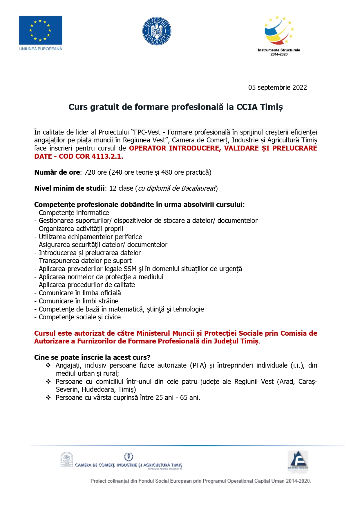 În calitate de lider al Proiectului “FPC-Vest – Formare profesională în sprijinul creșterii eficienței angajaților pe piața muncii în Regiunea Vest”, Camera de Comerț, Industrie și Agricultură Timiș face înscrieri pentru cursul de OPERATOR INTRODUCERE, VALIDARE ȘI PRELUCRARE DATE – COD COR 4113.2.1.