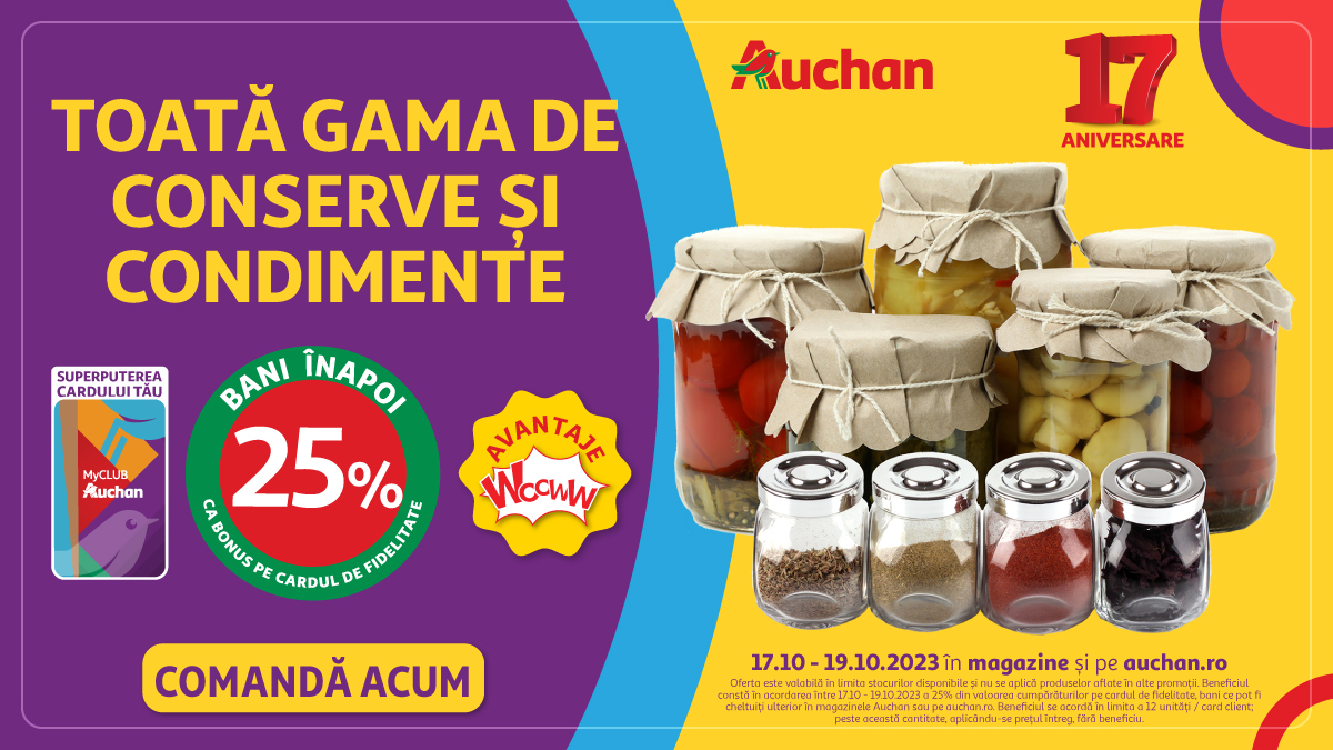 În plus, dacă ești membru MyCLUB Auchan, te bucuri de un beneficiu special: 25% bani înapoi ca bonus pe cardul de fidelitate la toată gama de conserve și condimente.