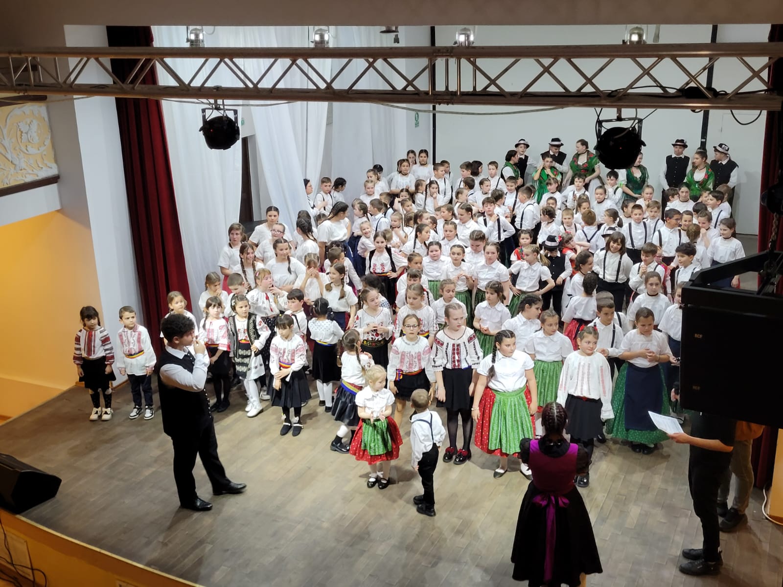 Membrii „Die Lustigen Lenauschüler” au încântat publicul cu frumoasele costume pentru copii șvabi, dansurile și cântecele autentice pentru copii din regiunea Banatului.