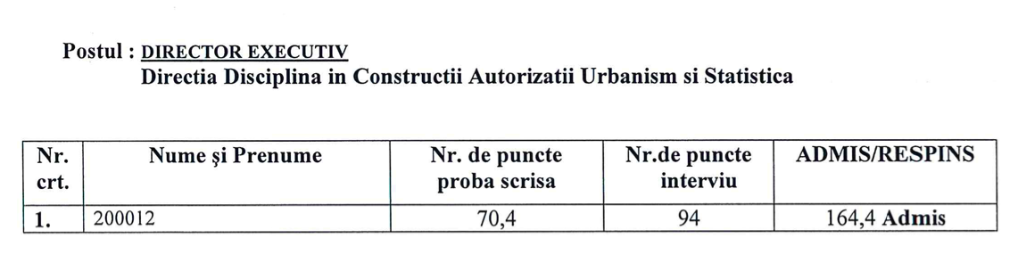 S-a înscris un singur candidat la concurs, dar reprezentanții primăriei au invocat GDPR, pentru că acesta n-ar fi vrut să se știe că își dorește postul, astfel că la rezultatele finale de la concurs apare un cod în loc de numele și prenumele candidatului admis. Candidatul a fost admis la proba scrisă cu 70,4 puncte din 100, iar la interviu a obținut 94 de puncte. Punctajul total este de 164,4, astfel că Magdalena Nicoară este noul director de la Urbanism.