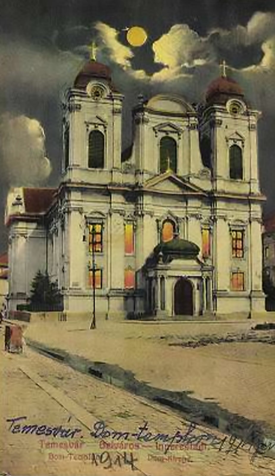 „În anul 1733, împăratul Carol al VI-lea mută sediul Episcopiei Diocezei Romano-Catolice de la Szeged la Timişoara. Așa s-a hotărât construirea unei catedrale, a unui palat episcopal şi a unor case pentru canonici. Construcția a fost încheiată abia în 1773. Cei mai bine cotați artiști ai epocii și-au adus aportul. Sculptorul vienez Johann Joseph Rossler (1700 – 1772) a creat cele două statui de mari dimensiuni, Sfântul Carol Boromeus şi Sfânta Theresia, cât şi perechea de heruvimi care domină ornamentaţia din partea centrală a altarului.
