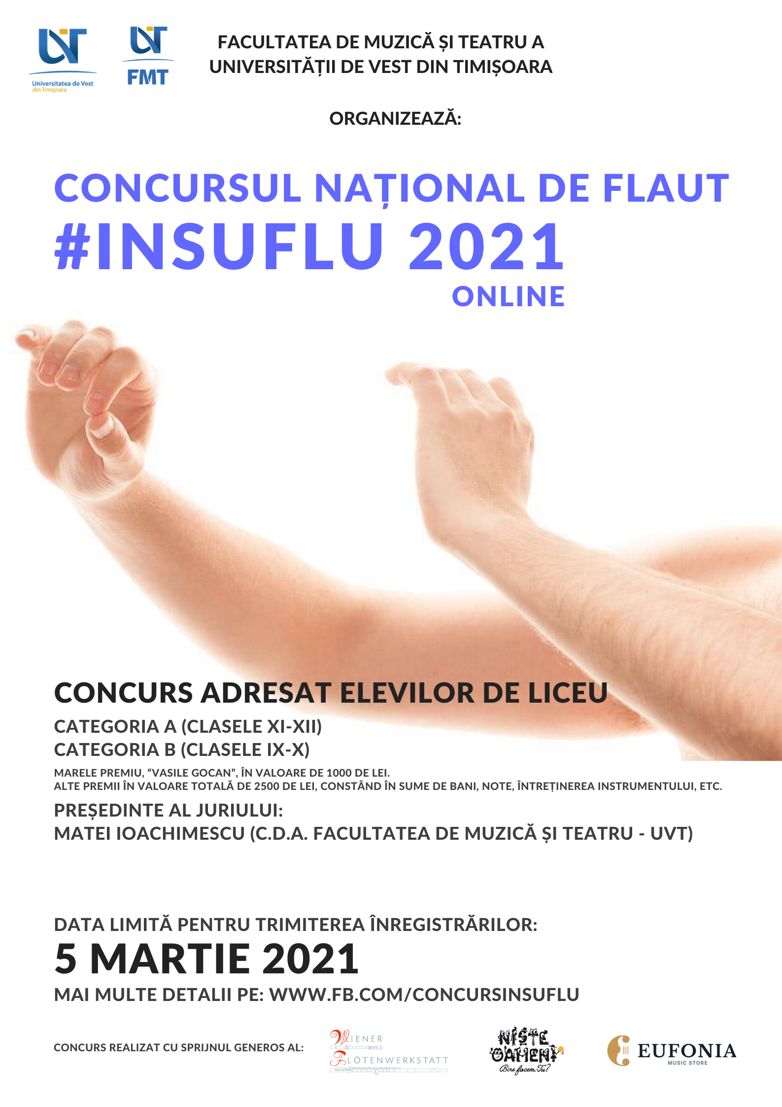 Concursul național de flaut „inSuflu”, organizat de Facultatea de Muzică și Teatru din cadrul UVT se adresează elevilor de liceu și este structurat pe două categorii: Categoria A (clasele XI-XII), Categoria B (clasele IX-X). Tinerii flautiști din clasele IX-XII sunt invitați să se înscrie în concurs prin trimiterea unei înregistrări din repertoriul impus pentru fiecare categorie, prin transfer, la adresa concursinsuflu@e-uvt.ro, până la data de 5 martie.