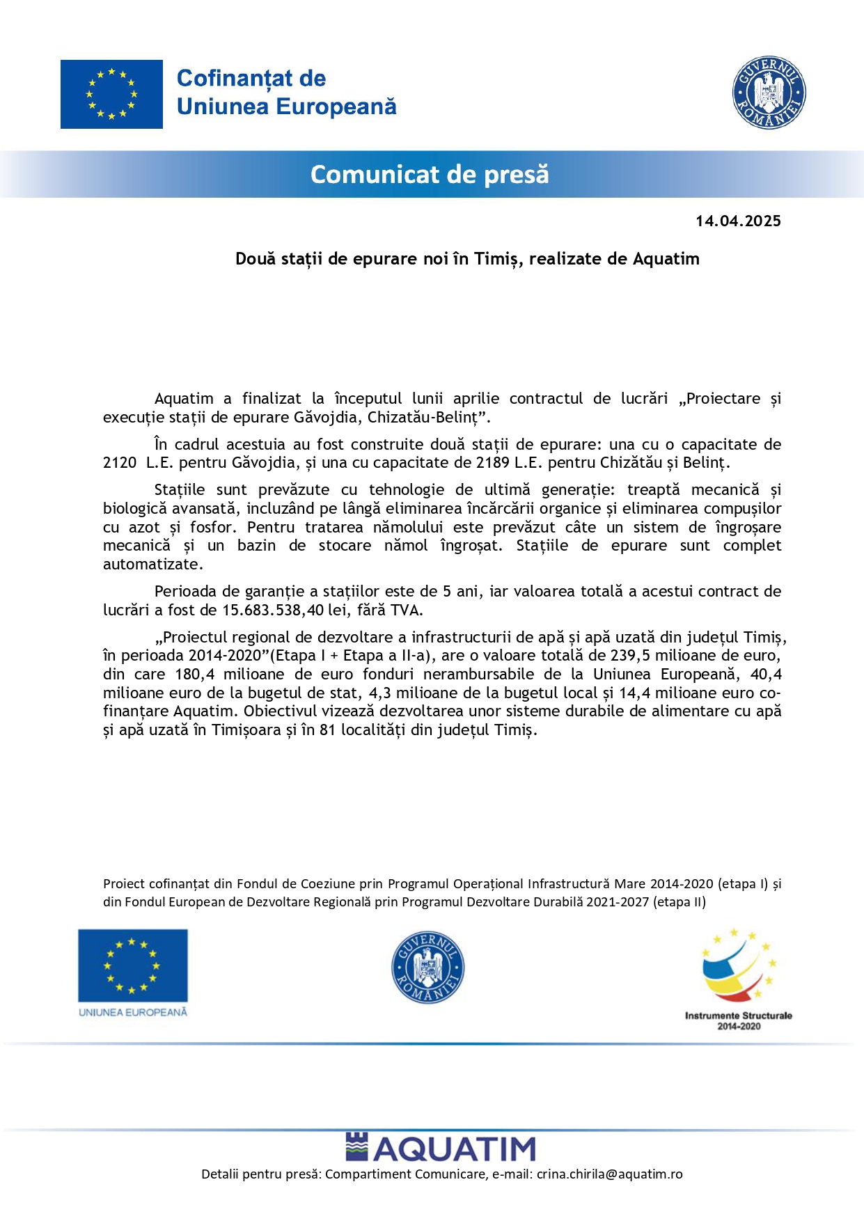 „Proiectul regional de dezvoltare a infrastructurii de apă și apă uzată din județul Timiș, în perioada 2014-2020”(Etapa I + Etapa a II-a), are o valoare totală de 239,5 milioane de euro, din care 180,4 milioane de euro fonduri nerambursabile de la Uniunea Europeană, 40,4 milioane euro de la bugetul de stat, 4,3 milioane de la bugetul local și 14,4 milioane euro co-finanțare Aquatim. Obiectivul vizează dezvoltarea unor sisteme durabile de alimentare cu apă și apă uzată în Timișoara și în 81 localități din județul Timiș.