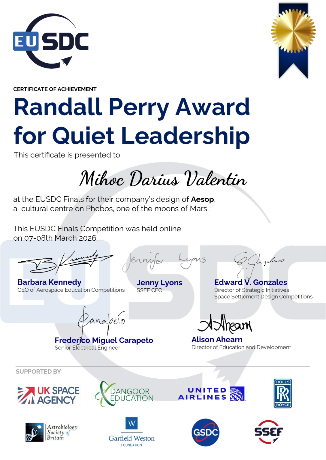 „Să fiu primul timișorean care reprezintă România și Europa la nivel mondial în această competiție este un vis devenit realitate și o responsabilitate uriașă. Îmi doresc ca prin această participare să contribui la promovarea și dezvoltarea ingineriei aerospațiale în România, un domeniu cu un potențial fantastic. Provocarea de 72 de ore din Florida va fi testul adevărat pentru tot ce am învățat și sper că reușita mea va inspira și alți tineri să aibă curajul de a ținti cât mai sus”, a transmis Darius Mihoc.
