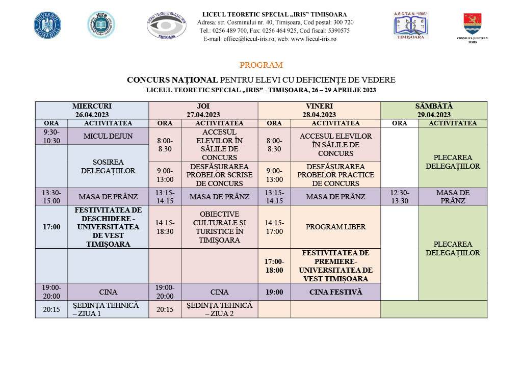 „Etapa locală se va desfășura la nivelul unităților școlare din țară implicate iar etapa națională a concursului se va desfășura la Liceul Teoretic Special «Iris» Timișoara .În prima zi vor avea loc probele scrise, iar a doua zi probele practice. Pentru toți participanții va fi organizată o seară culturală și o excursie de promovare a valorilor culturale din județul Timiș. Premierea participanților se va face individual pentru ambele probe”, spun reprezentanții IȘJ Timiș.
