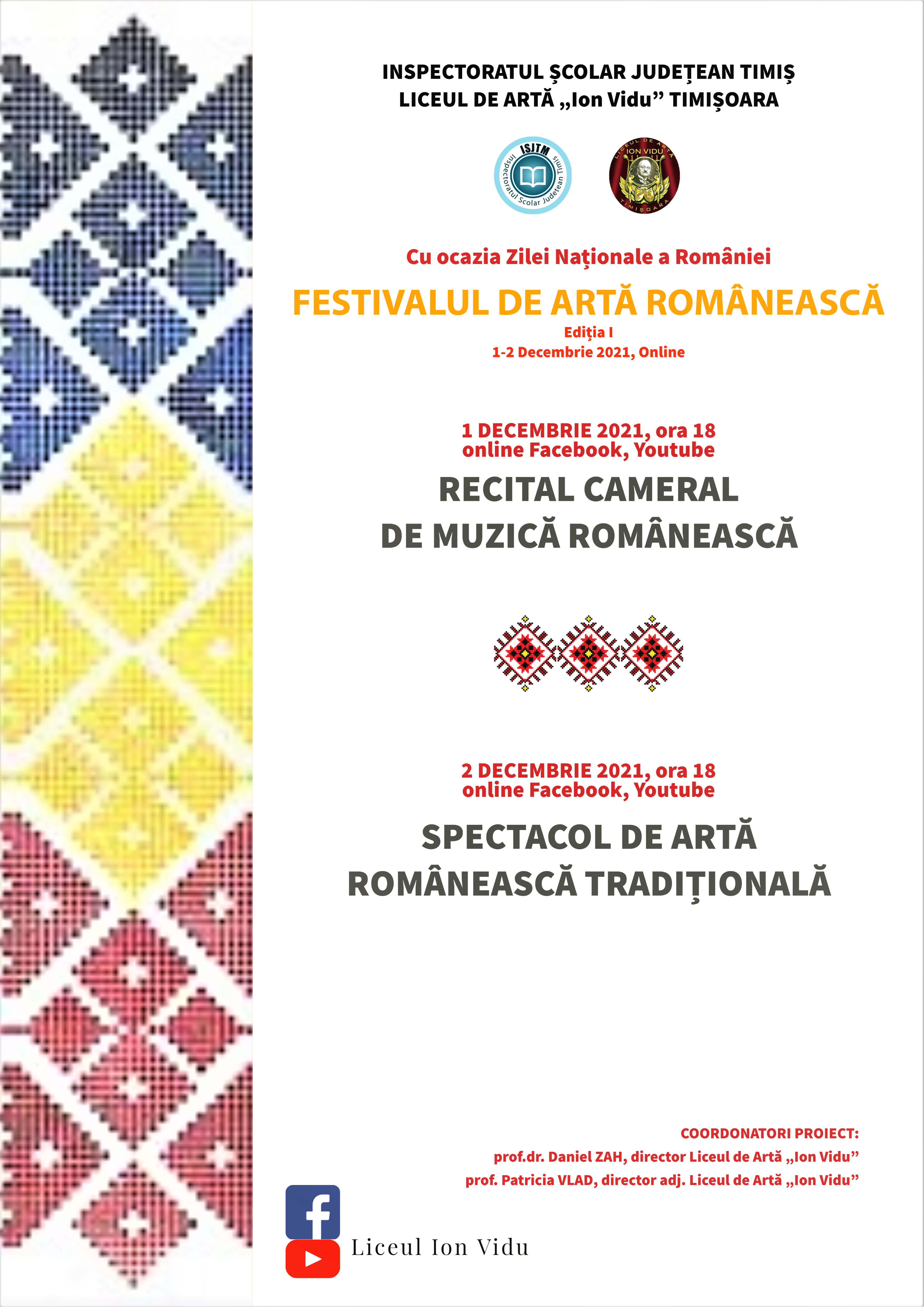 Pe 1 și 2 decembrie, de la ora 18 va începe Festivalul de Artă Românească online, pe pagina de Facebook și YouTube a instituției de învățământ „Liceul Ion Vidu”.