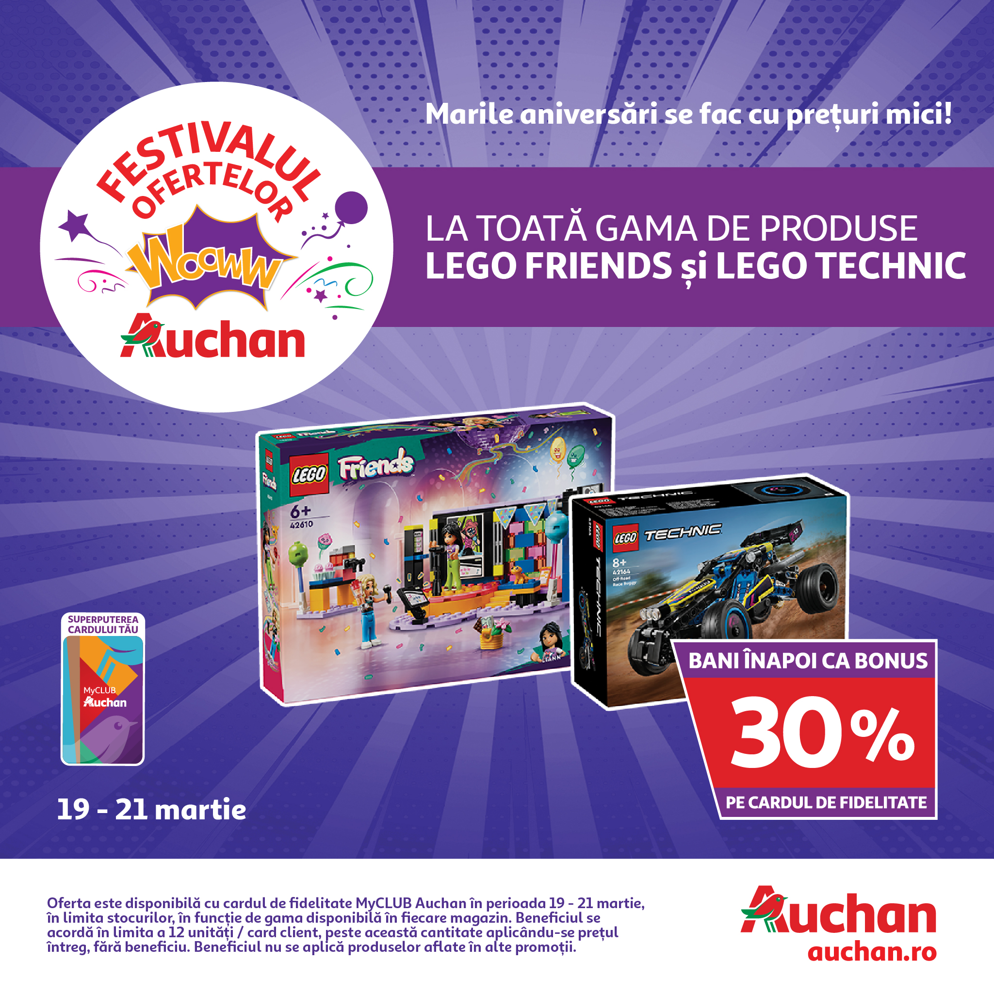 În plus, tot în perioada 19 – 21 martie, ai 30% bani înapoi ca bonus pe cardul de fidelitate la toată gama de produse Lego Friends și Lego Technic.