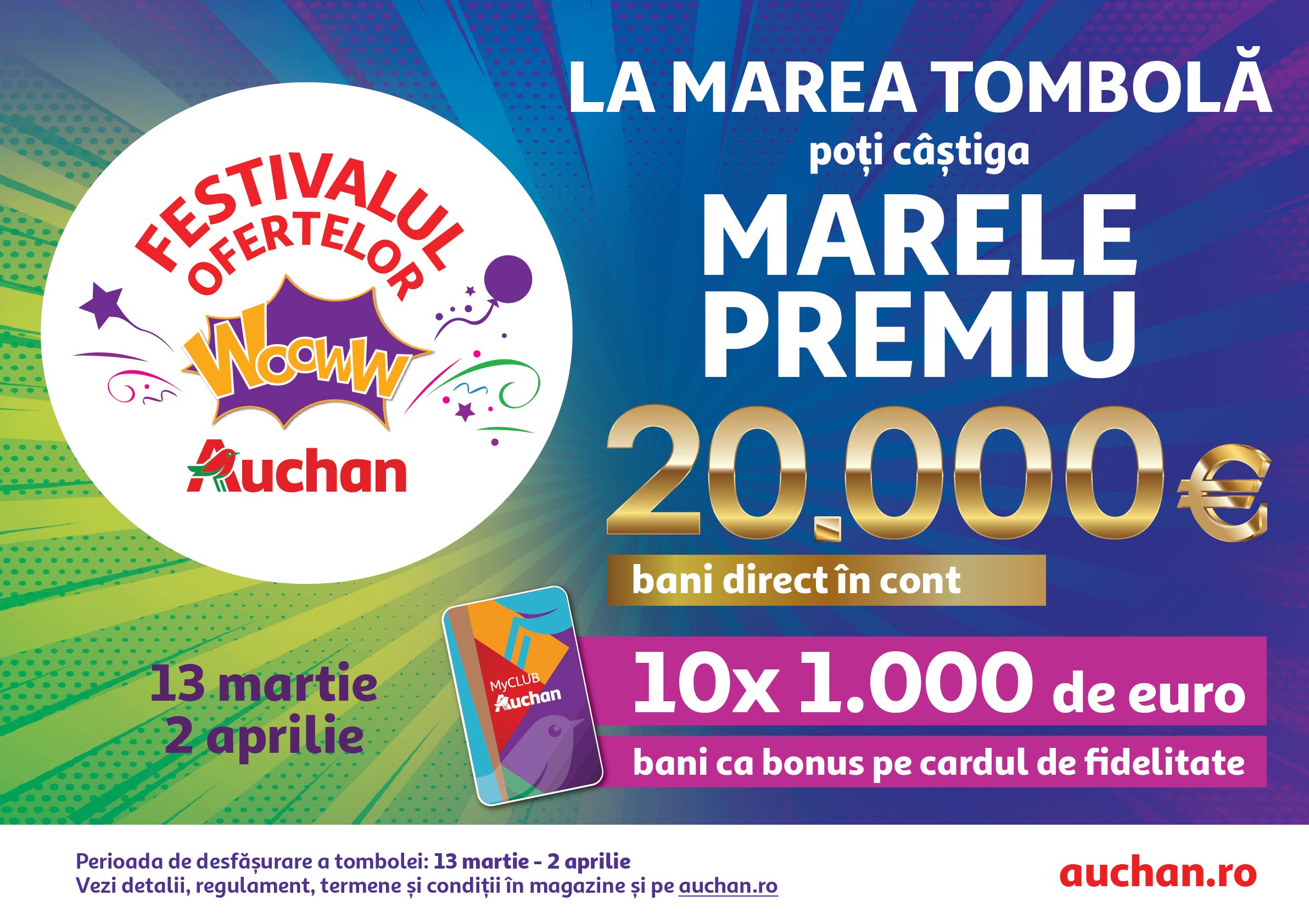 Simpla folosire a cardului MyClub Auchan la cumpărături, până pe 2 aprilie, aduce șansa câștigării marelui premiu de 20.000 euro (echivalentul în lei), direct în cont sau a unuia din cele 10 premii de 1.000 Euro, echivalentul în lei transmis ca bonus pe cardul de fidelitate, în cadrul unei tombole special dedicate evenimentului comercial. Regulamentul acțiunii se găsește pe auchan.ro și în magazine.