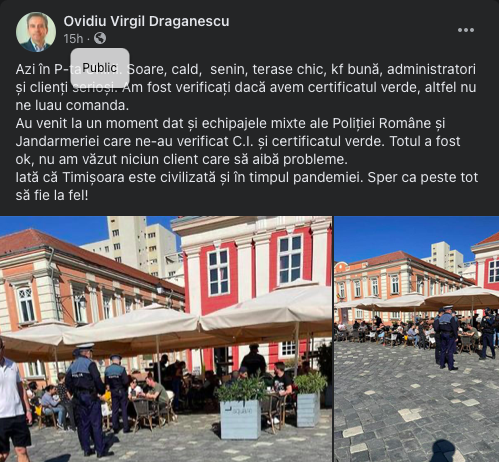 „Azi în P-ta Unirii. Soare, cald, senin, terase chic, kf bună, administratori și clienți serioși. Am fost verificați dacă avem certificatul verde, altfel nu ne luau comanda. Au venit la un moment dat și echipajele mixte ale Poliției Române și Jandarmeriei care ne-au verificat C.I. și certificatul verde. Totul a fost ok, nu am văzut niciun client care să aibă probleme. Iată că Timișoara este civilizată și în timpul pandemiei. Sper ca peste tot să fie la fel!”, a scris Drăgănescu, duminică, pe Facebook.