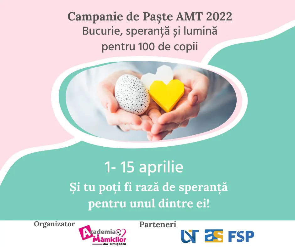 Academia Mămicilor Timișoara (ATM), prin campania de Paște din acest an, dorește să ajungă la 100 de copii care au nevoie de speranță, încredere și susținere din două localități din județul Timiș: Bencecu de Jos și Cenei. Sunt copii din familii defavorizate, copii cu risc de abandon școlar, copii care au nevoie să știe că nu sunt singuri.