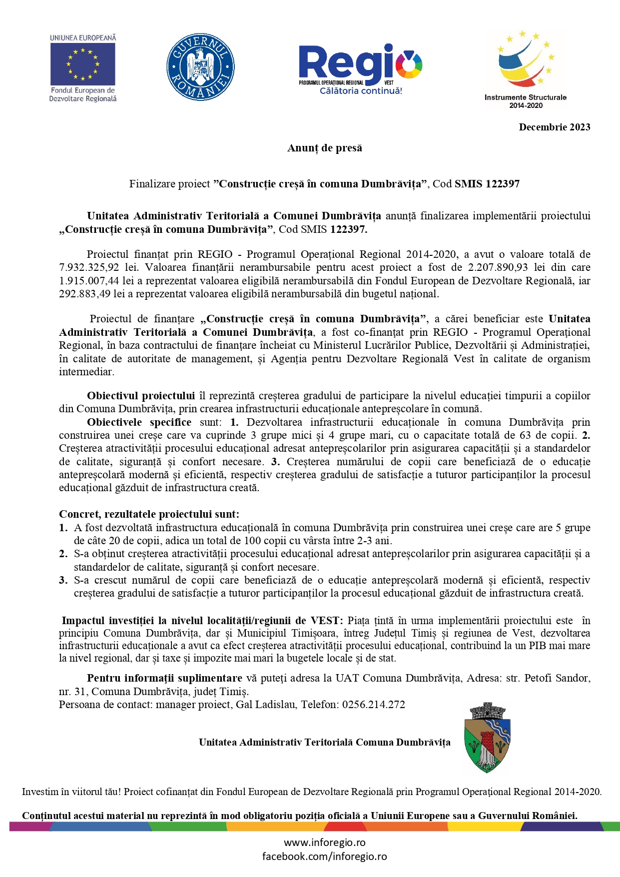 Pentru informaţii suplimentare vă puteţi adresa la UAT Comuna Dumbrăvița, Adresa: str. Petofi Sandor, nr. 31, Comuna Dumbrăvița, județ Timiș. Persoana de contact: manager proiect, Gal Ladislau, Telefon: 0256.214.272
