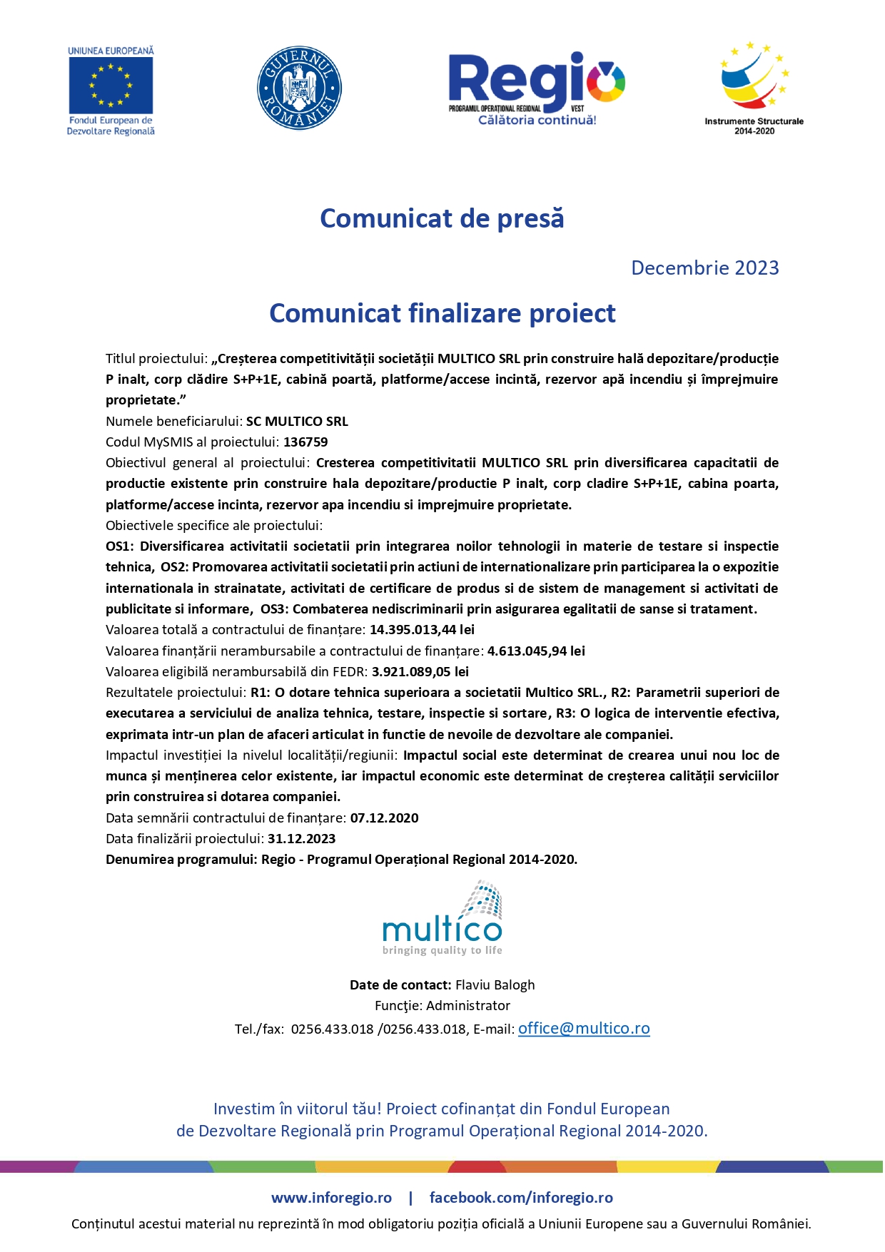 Titlul proiectului: „Creșterea competitivității societății MULTICO SRL prin construire hală depozitare/producție P inalt, corp clădire S+P+1E, cabină poartă, platforme/accese incintă, rezervor apă incendiu și împrejmuire proprietate.”