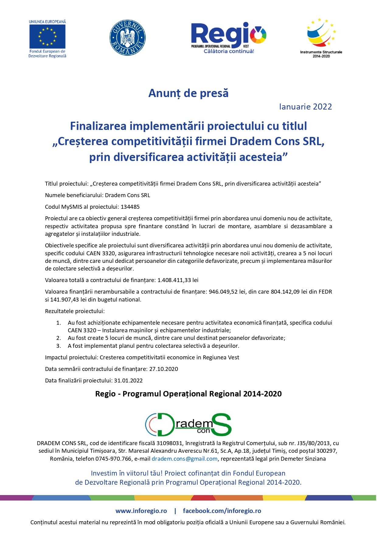 Finalizarea implementării proiectului cu titlul „Creșterea competitivității firmei Dradem Cons SRL, prin diversificarea activității acesteia”