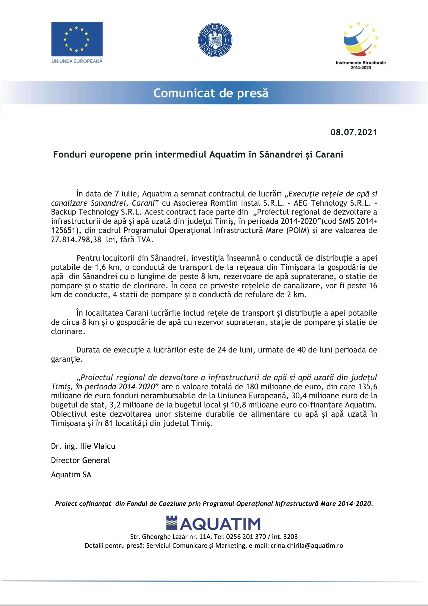 „Proiectul regional de dezvoltare a infrastructurii de apă și apă uzată din județul Timiș, în perioada 2014-2020” are o valoare totală de 180 milioane de euro, din care 135,6 milioane de euro fonduri nerambursabile de la Uniunea Europeană, 30,4 milioane euro de la bugetul de stat, 3,2 milioane de la bugetul local și 10,8 milioane euro co-finanțare Aquatim. Obiectivul este dezvoltarea unor sisteme durabile de alimentare cu apă și apă uzată în Timișoara și în 81 de localități din județul Timiș.