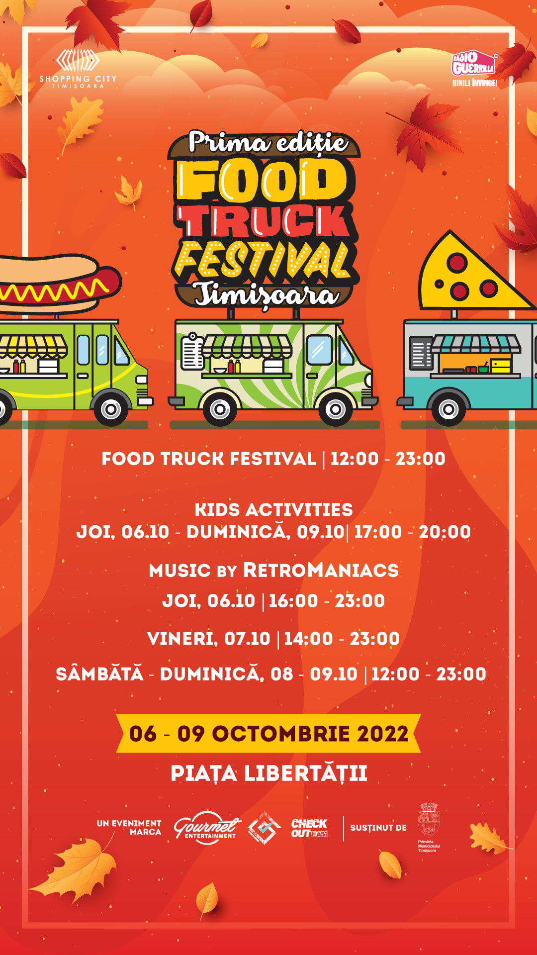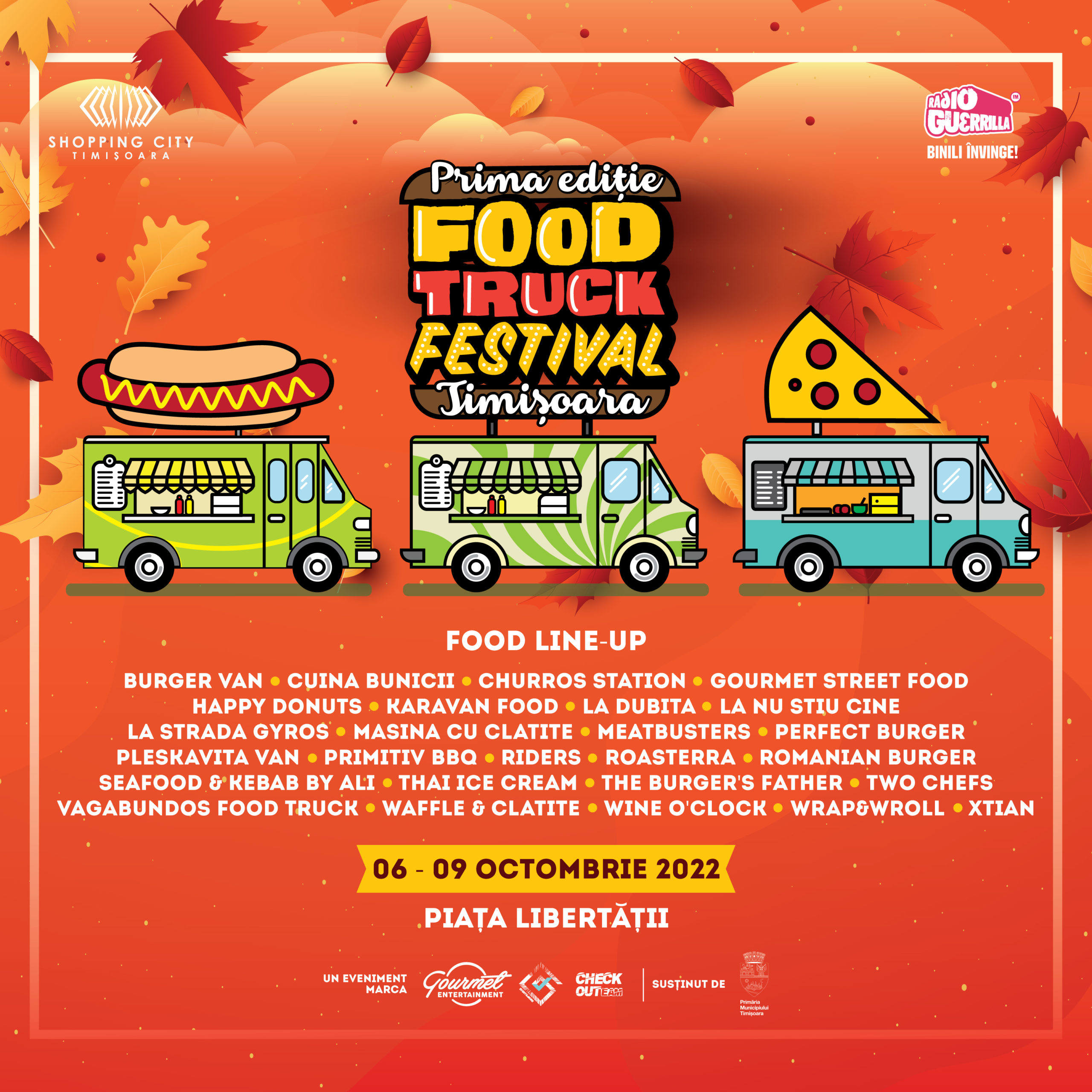 Food Line-up: Burger Van ★ Cuina Bunicii ★ Churros Station ★ Gourmet Street Food ★ Happy Donuts ★ Karavan Food ★ La Dubița ★ La nu știu cine ★ La Strada Gyros ★ Mașina cu Clătite ★ Meatbusters ★ Perfect Burger ★ Pleskavița Van ★ Primitiv BBQ ★ Riders ★ Roasterra ★ Romanian Burger ★ Seafood & Kebab by Ali ★ Thai Ice Cream ★ The Burger’s Father ★ Two Chefs ★ Vagabundos Food Truck ★ Waffle & Clatite ★ Wine O’clock ★ Wrap&Wroll ★ Xtian.