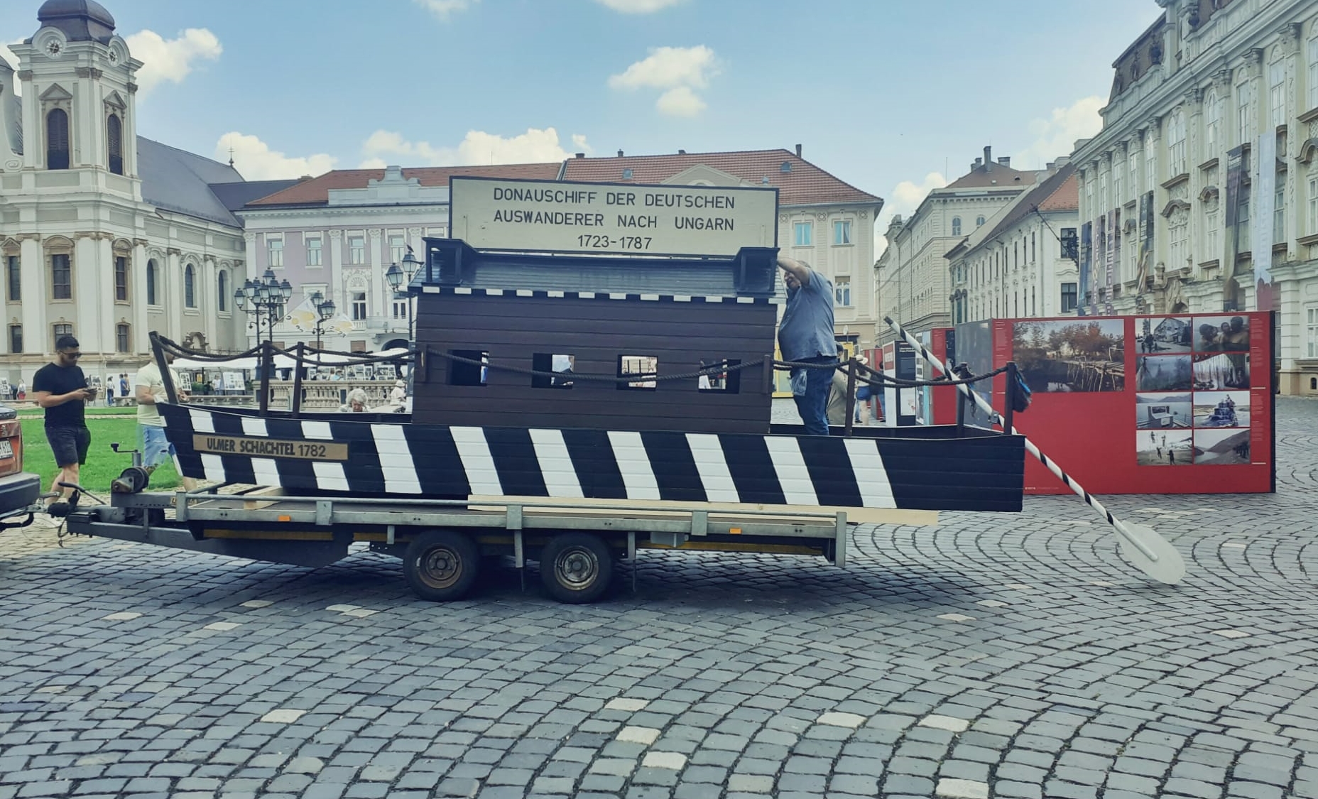 Încă de vineri, în Piața Unirii din Timișoara poate fi văzută o replică a unei ambarcațiuni tradiționale, asemenea celor pe care strămoșii șvabilor le-au folosit acum 300 de ani pentru a ajunge în Banat. Replica, realizată cu măiestrie de Erich Meier, va fi ulterior donată Fundației Adam Muller Guttenbrunn din Timișoara. Aceasta are o lungime de peste șase metri.