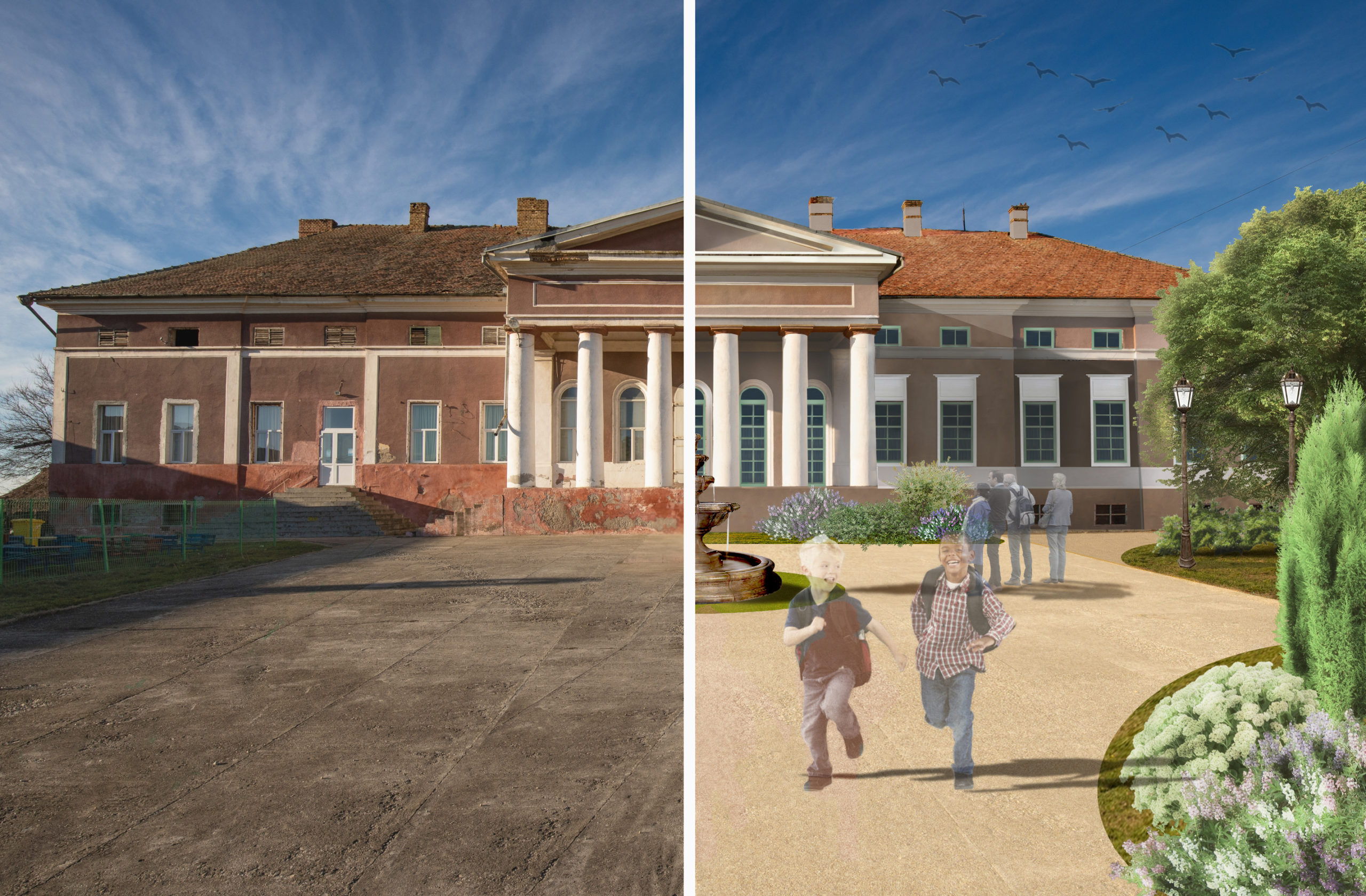 Curtea și grădina vor fi amenajate cu ajutorul peisagiștilor, pentru a permite organizarea de evenimente în exterior. Subsolul și podul vor fi igienizate, consolidate și vor servi ca spații tehnice.