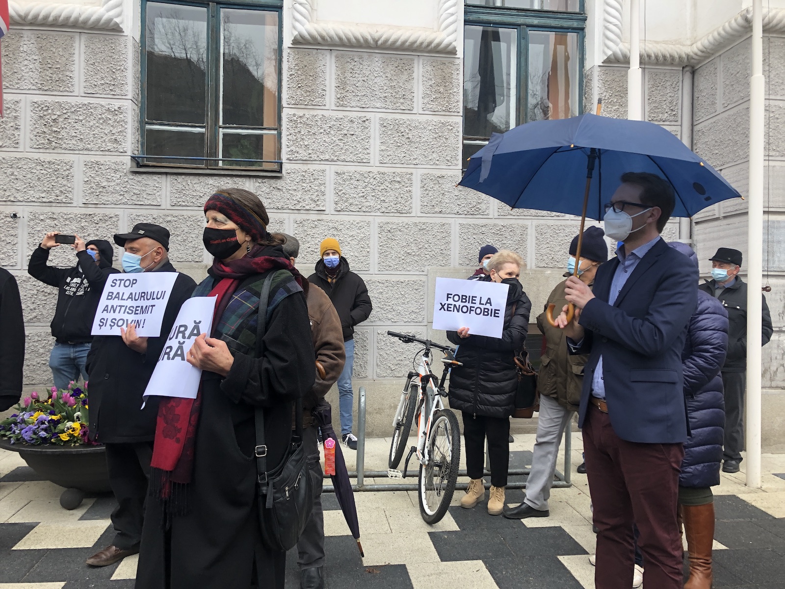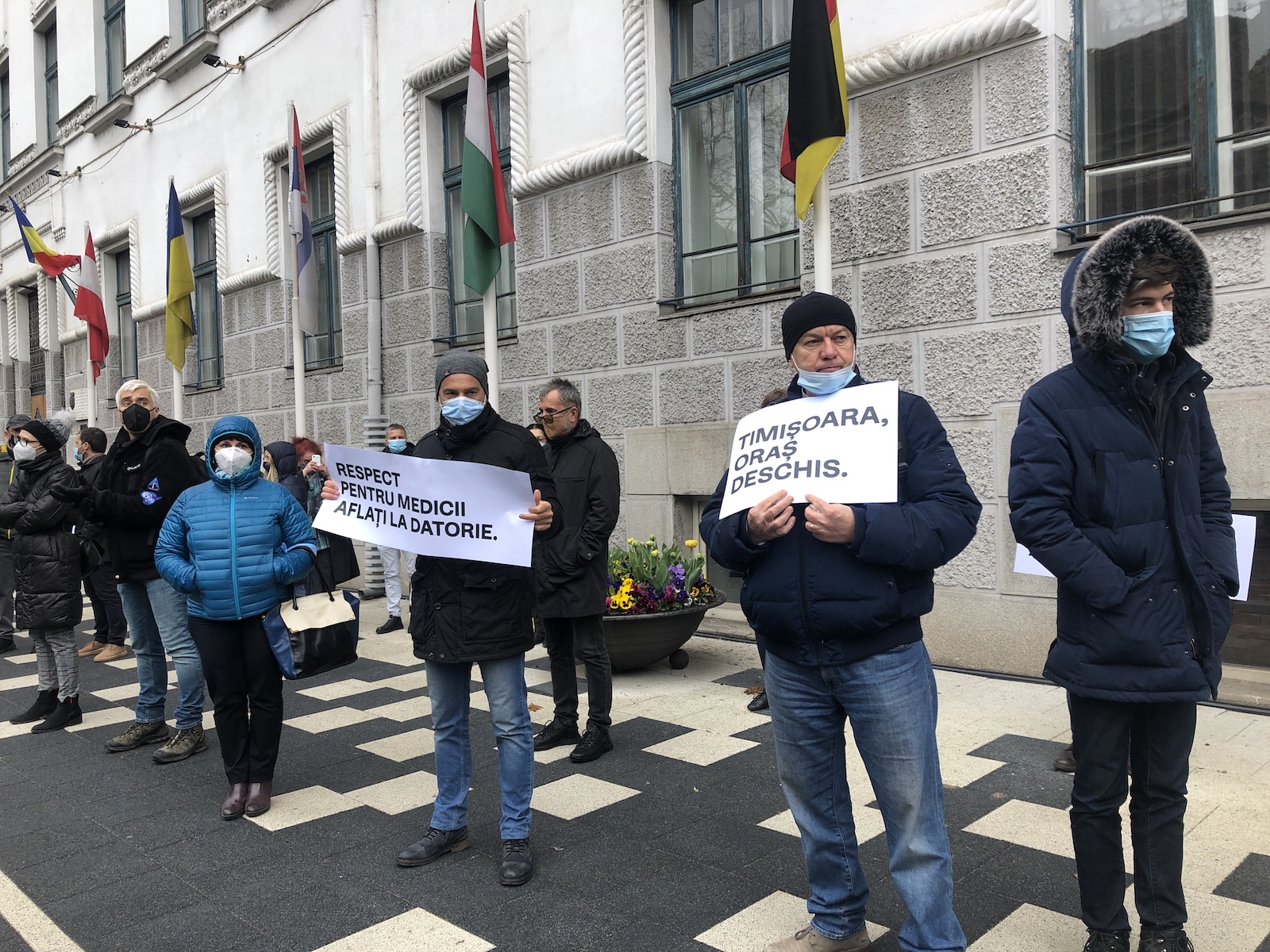 Scriitori, medici, profesori au vorbit, marți după-amiază, la portavoce, în fața clădirii primăriei. Oamenii s-au adunat să arate că sunt împotriva celor care au ieșit în ultimele săptămâni la proteste pe străzile Timișoarei și chiar în fața casei primarului Dominic Fritz.