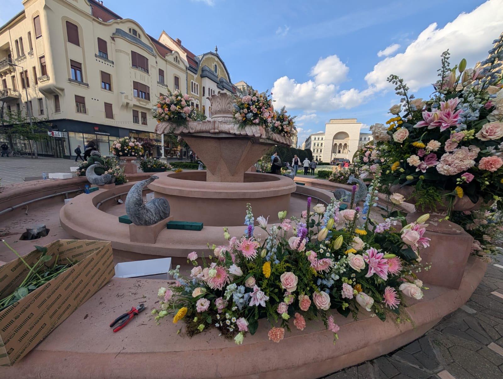 Casa de Cultură a Municipiului Timișoara a decis ca și anul acesta, de Florii, să pună aranjamente florale la Fântâna cu Pești.