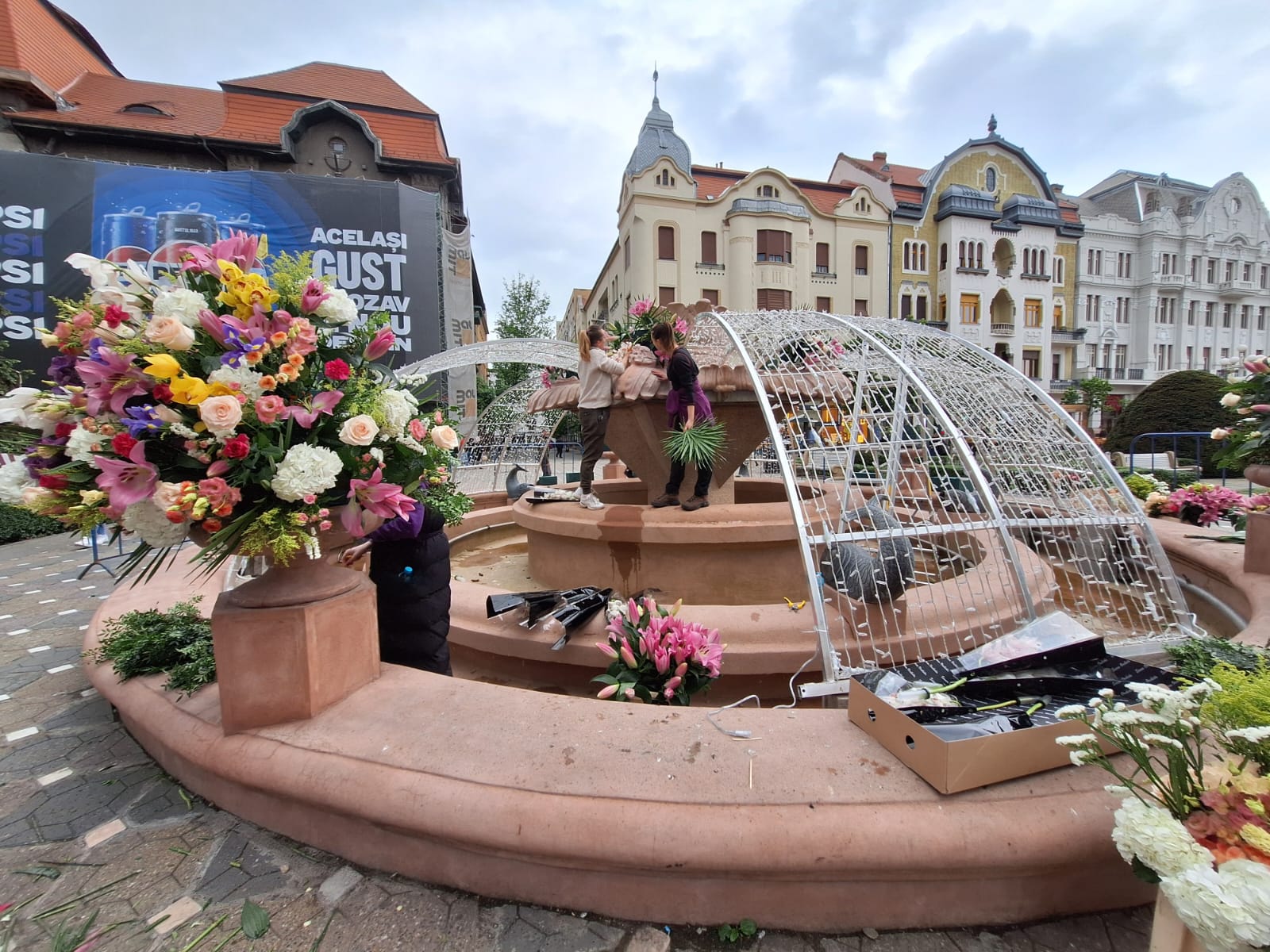 Casa de Cultură a Municipiului a decis ca anul acesta, de Florii, să pună aranjamente florale la Fântâna cu Pești, precum și în Piața Unirii.